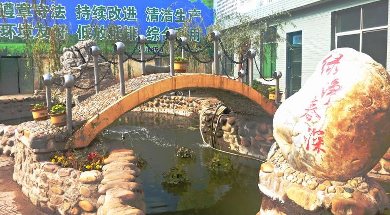 最吸引眼球的莫過于車間辦公室前面的小花池了!形色各異的石頭砌就的圍堰獨具特色,碧綠的池水上架著一座微型拱橋,廢舊物料制作的銀白色立柱、圓球形套環(huán)與黑褐色鐵鏈組成的安全護欄,一下子把小橋裝扮得韻味十足。兩塊形態(tài)獨特的文化石屹立在池水中,一塊寫著“清風池”,另一塊寫著“綠凈春深”;水面上的噴頭如一朵小蓮花正吐露著銀色的水花;難得的暖陽灑向水面,紅色、黃色、銀白色的小金魚聞聲成群結(jié)隊地向我們游來,不時激起一圈圈漣漪?!扒屣L池”上微風徐來,“綠凈春深”意境悠遠,怎一個美字了得?不由得讓人駐足觀望,仿佛自己走進了鬧市中公園一角。