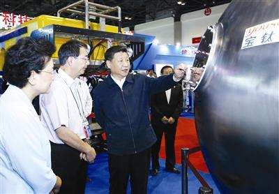 新華社照片,北京,2016年6月3日,中共中央總書記、國家主席、中央軍委主席習(xí)近平在北京展覽館參觀國家“十二五”科技創(chuàng)新成就展時,在寶鈦集團(tuán)生產(chǎn)的4500米深潛器球殼前駐足了解情況,并給予高度評價。  新華社記者 鞠鵬 攝