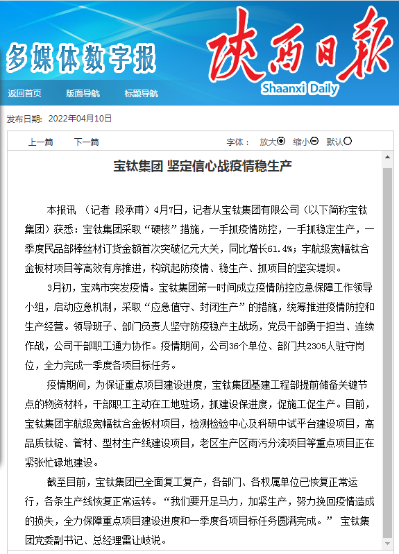 3月初,寶雞市突發(fā)疫情。寶鈦集團第一時間成立疫情防控應急保障工作領導小組,啟動應急機制,采取“應急值守、封閉生產”的措施,統籌推進疫情防控和生產經營。領導班子、部門負責人堅守防疫穩(wěn)產主戰(zhàn)場,黨員干部勇于擔當、連續(xù)作戰(zhàn),公司干部職工通力協作。疫情期間,公司36個單位、部門共2305人駐守崗位,全力完成一季度各項目標任務。