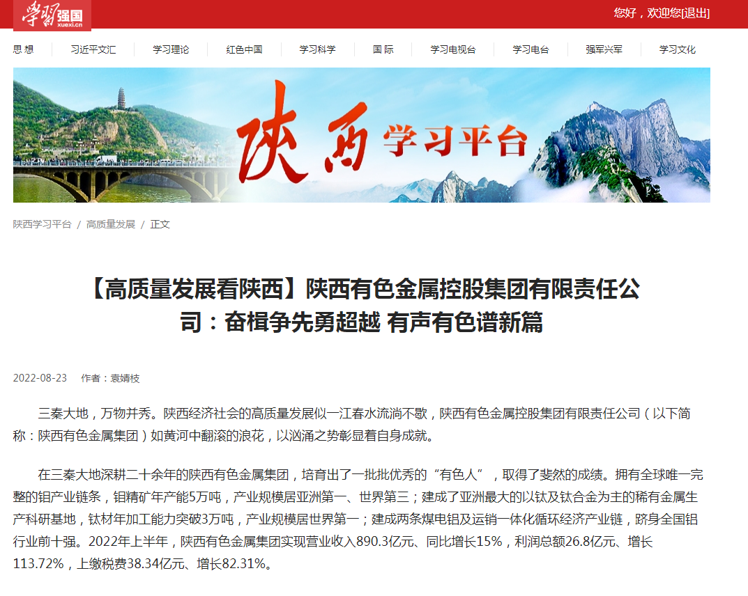 陜西日報(bào)、學(xué)習(xí)強(qiáng)國:奮楫爭先勇超越 有聲有色譜新篇——陜西有色金屬控股集團(tuán)有限責(zé)任公司奏響高質(zhì)量發(fā)展更強(qiáng)音