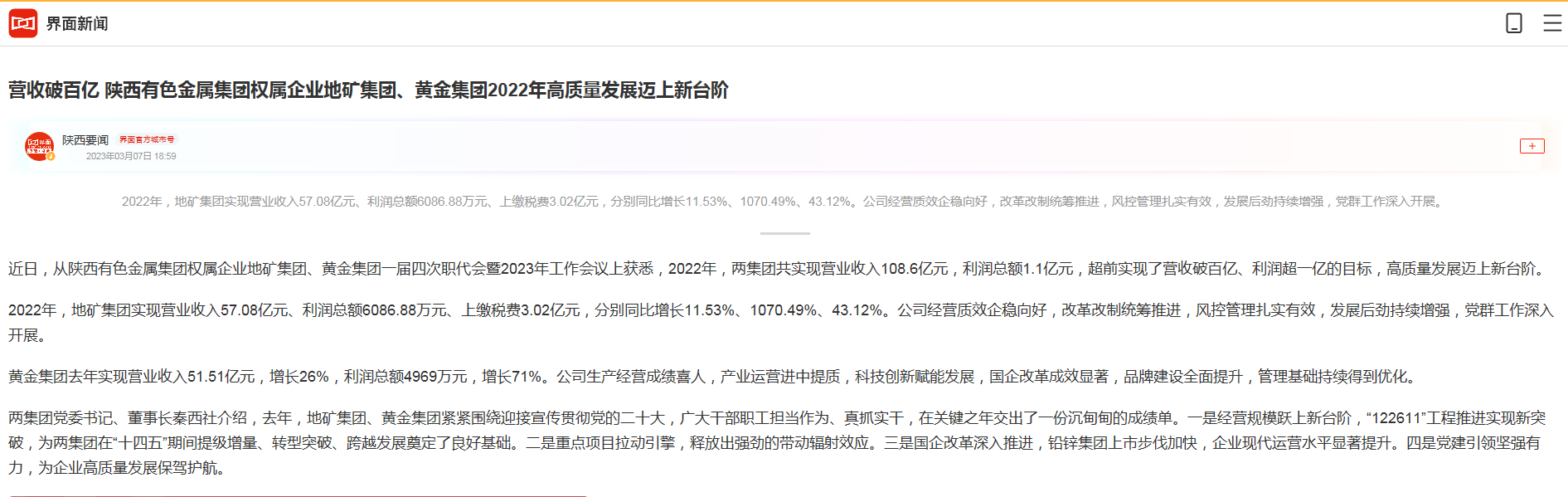 近日,從陜西有色金屬集團權(quán)屬企業(yè)地礦集團、黃金集團一屆四次職代會暨2023年工作會議上獲悉,2022年,兩集團共實現(xiàn)營業(yè)收入108.6億元,利潤總額1.1億元,超前實現(xiàn)了營收破百億、利潤超一億的目標,高質(zhì)量發(fā)展邁上新臺階。