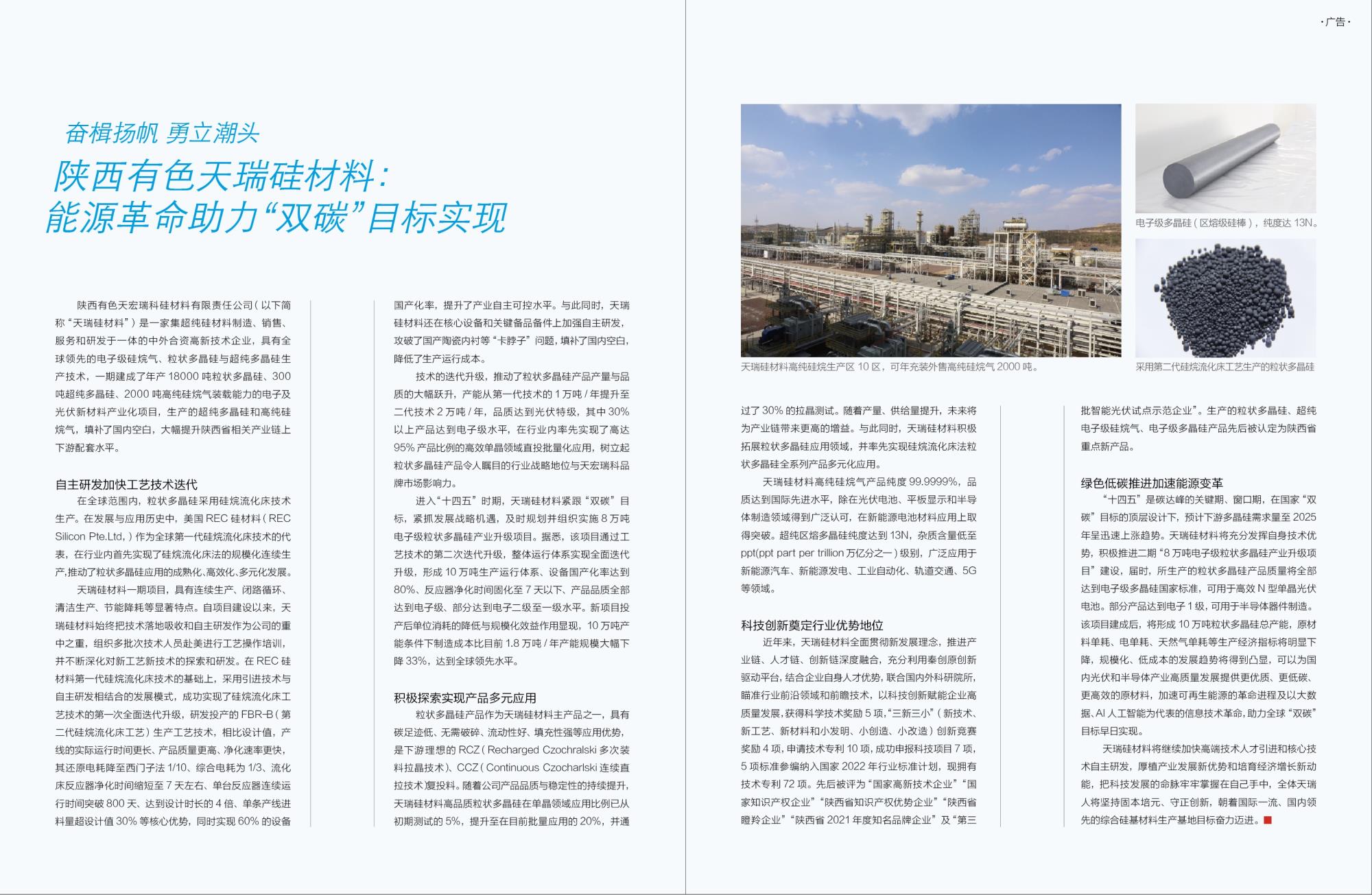 陜西有色天宏瑞科硅材料有限責任公司(以下簡稱“天瑞硅材料”)是一家集超純硅材料制造、銷售、服務和研發(fā)于一體的中外合資高新技術企業(yè),具有全球領先的電子級硅烷氣、粒狀多晶硅與超純多晶硅生產(chǎn)技術,一期建成了年產(chǎn)18000噸粒狀多晶硅、300噸超純多晶硅、2000噸高純硅烷氣裝載能力的電子及光伏新材料產(chǎn)業(yè)化項目,生產(chǎn)的超純多晶硅和高純硅烷氣,填補了國內(nèi)空白,大幅提升陜西省相關產(chǎn)業(yè)鏈上下游配套水平。