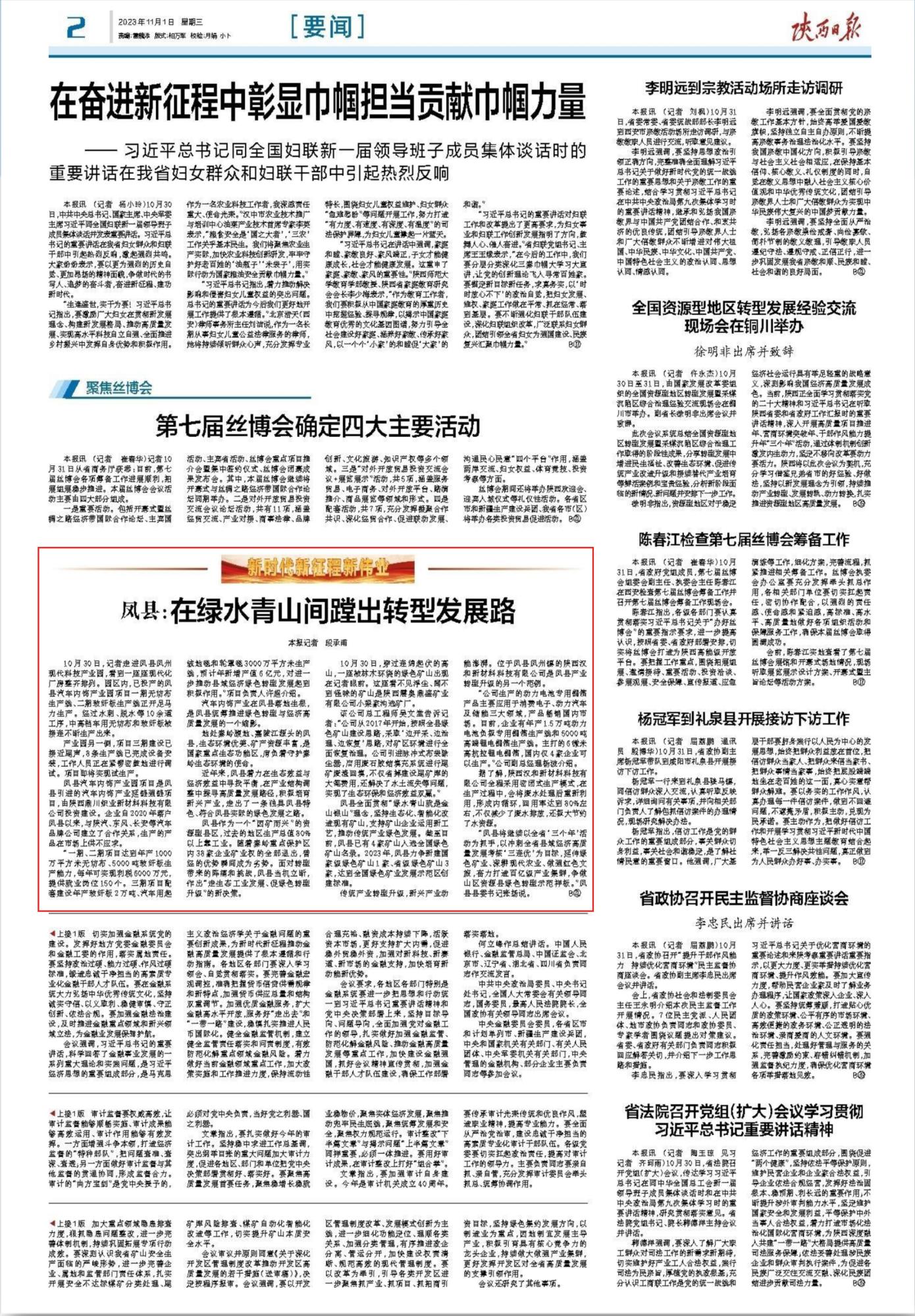 編者按:陜西日報2023年11月1日2版刊發(fā)《鳳縣:在綠水青山間蹚出轉(zhuǎn)型發(fā)展路》一文。其中,記者走進地礦集團權(quán)屬企業(yè)鉛鋅集團鳳縣分公司(原陜西震奧鼎盛礦業(yè)有限公司),采訪公司綠色礦山建設(shè)成果。全文如下: