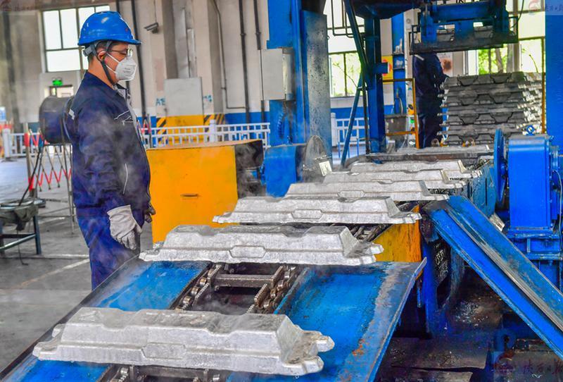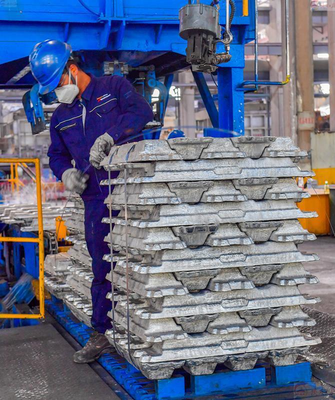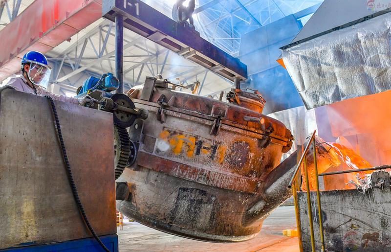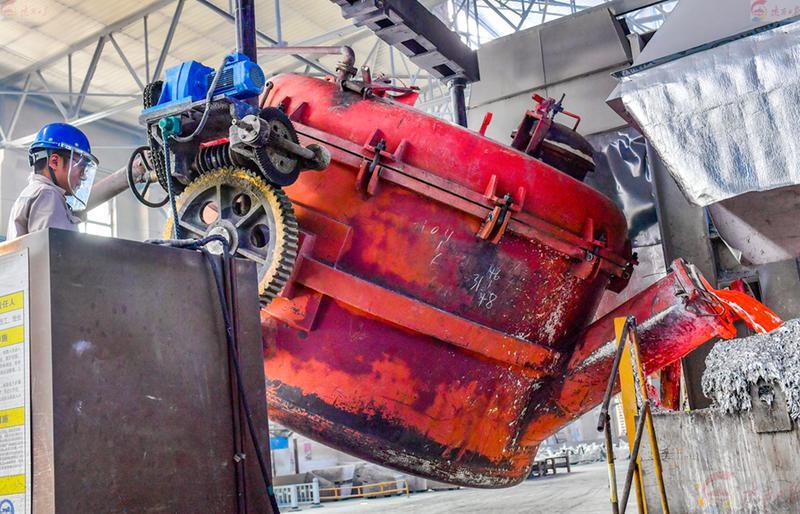 6月12日,在陜西有色榆林新材料集團(tuán)鑄造車間,工人正進(jìn)行入鋁作業(yè)。