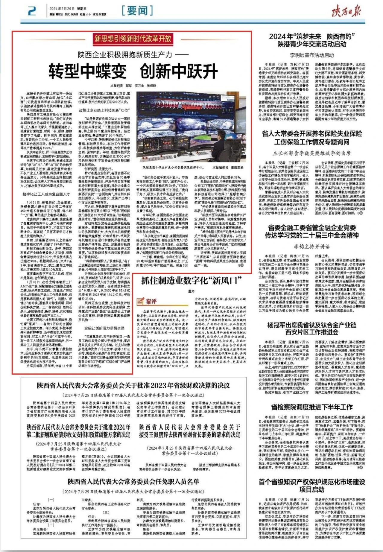 7月26日,《陜西日報》2版頭條刊發(fā)文章《陜西企業(yè)積極擁抱新質生產力——轉型中蝶變創(chuàng)新中躍升》。文章集中報道我省一批制造業(yè)鏈主企業(yè)深化體制機制改革,推動企業(yè)高質量發(fā)展的成功經驗。其中,陜西黃金集團西安匯創(chuàng)公司作為我省重點科技型企業(yè),通過靈活實施股權激勵、超額利潤分享等中長期鼓勵激勵機制,充分激發(fā)了員工干事創(chuàng)業(yè)活力,《陜西日報》稱贊其“一子落,滿盤活”。