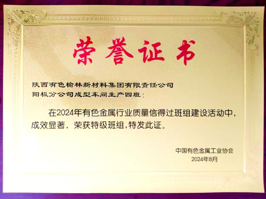 近日,2023—2024年度有色金屬行業(yè)優(yōu)秀質量管理小組、質量信得過班組等活動評選結果揭曉,榆林新材料集團陽極分公司成型車間生產(chǎn)四班榮獲2023——2024年度有色金屬行業(yè)質量信得過班組“特級班組”稱號。
