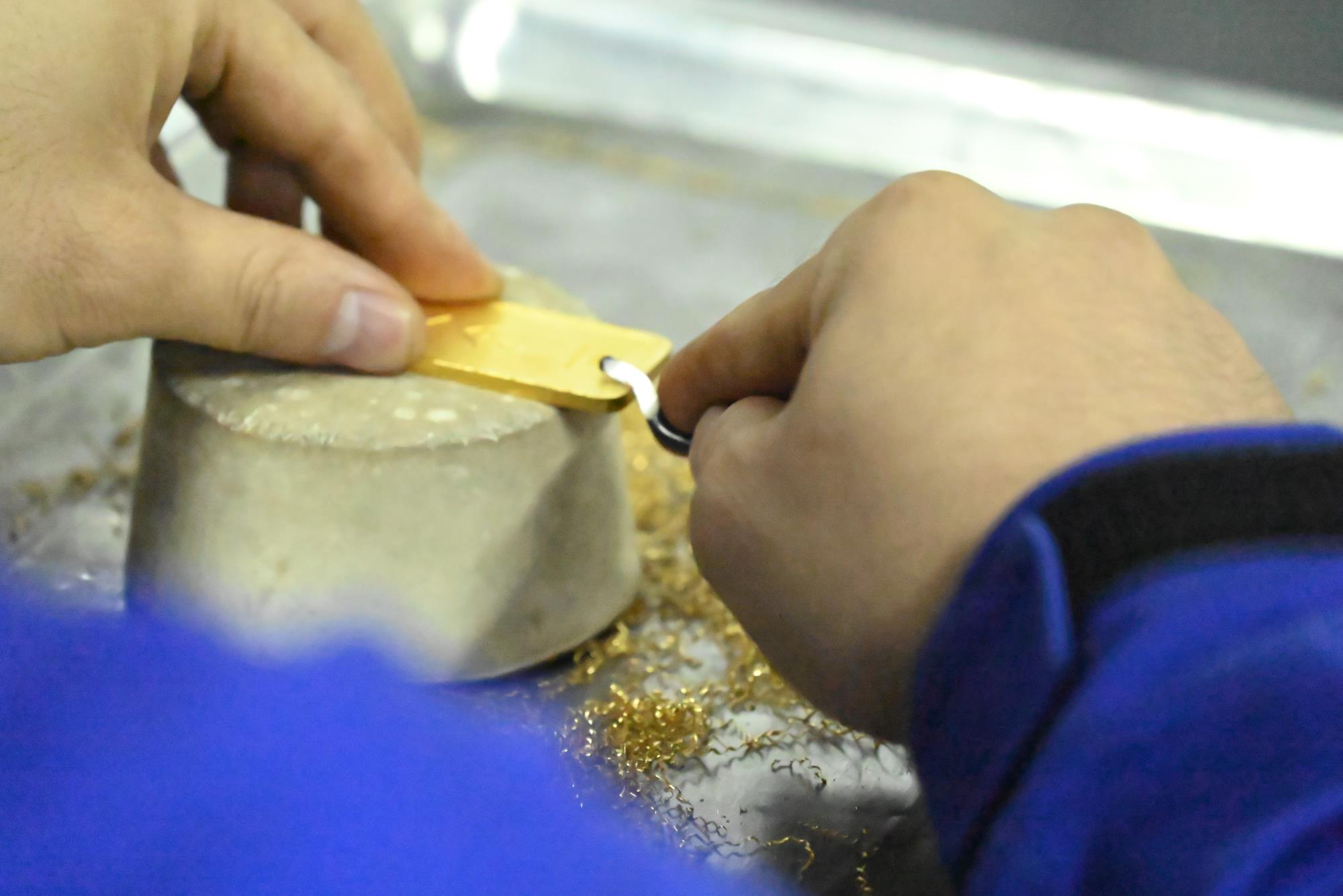在陜西黃金集團(tuán)西安秦金有限責(zé)任公司(以下簡(jiǎn)稱“西安秦金公司”)的貴金屬加工制造車間,工人們正在為鍛造成型的金條壓上“秦金”的標(biāo)志。經(jīng)過(guò)鑄毛坯—壓板—落料—找重—退火、沾酸—壓花—修邊找重—拋光—編號(hào)—清洗—成品包裝的工序后,一塊標(biāo)準(zhǔn)金條就誕生了。
