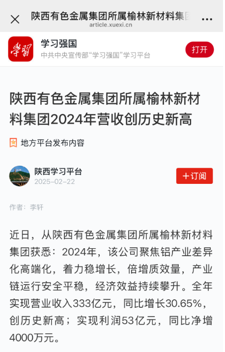 2月22日,中共中央宣傳部“學習強國”學習平臺連續(xù)刊發(fā)兩篇報道介紹了榆林新材料集團2024年生產(chǎn)經(jīng)營和綠色產(chǎn)業(yè)鏈發(fā)展情況