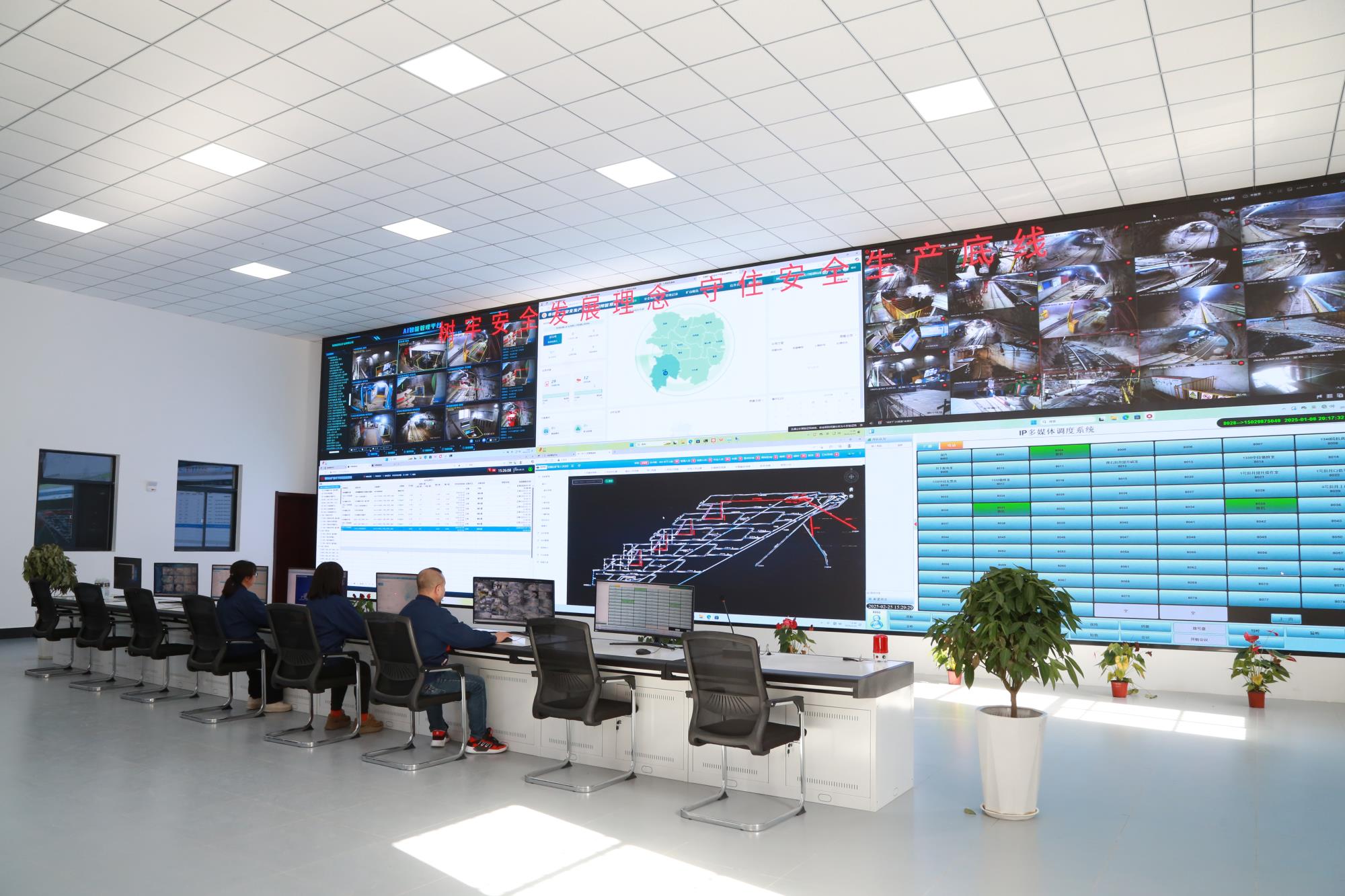 2月19日,在西北有色地礦集團(tuán)權(quán)屬鉛鋅集團(tuán)鉛硐山礦業(yè)公司調(diào)度指揮中心,工作人員點(diǎn)擊鼠標(biāo)便可實(shí)現(xiàn)井上井下視頻通話,水泵、風(fēng)機(jī)等停送電控制。這里是礦山調(diào)度的“智慧大腦”,井下的每一個(gè)關(guān)鍵作業(yè)畫面都清晰地反映在監(jiān)控大屏上。