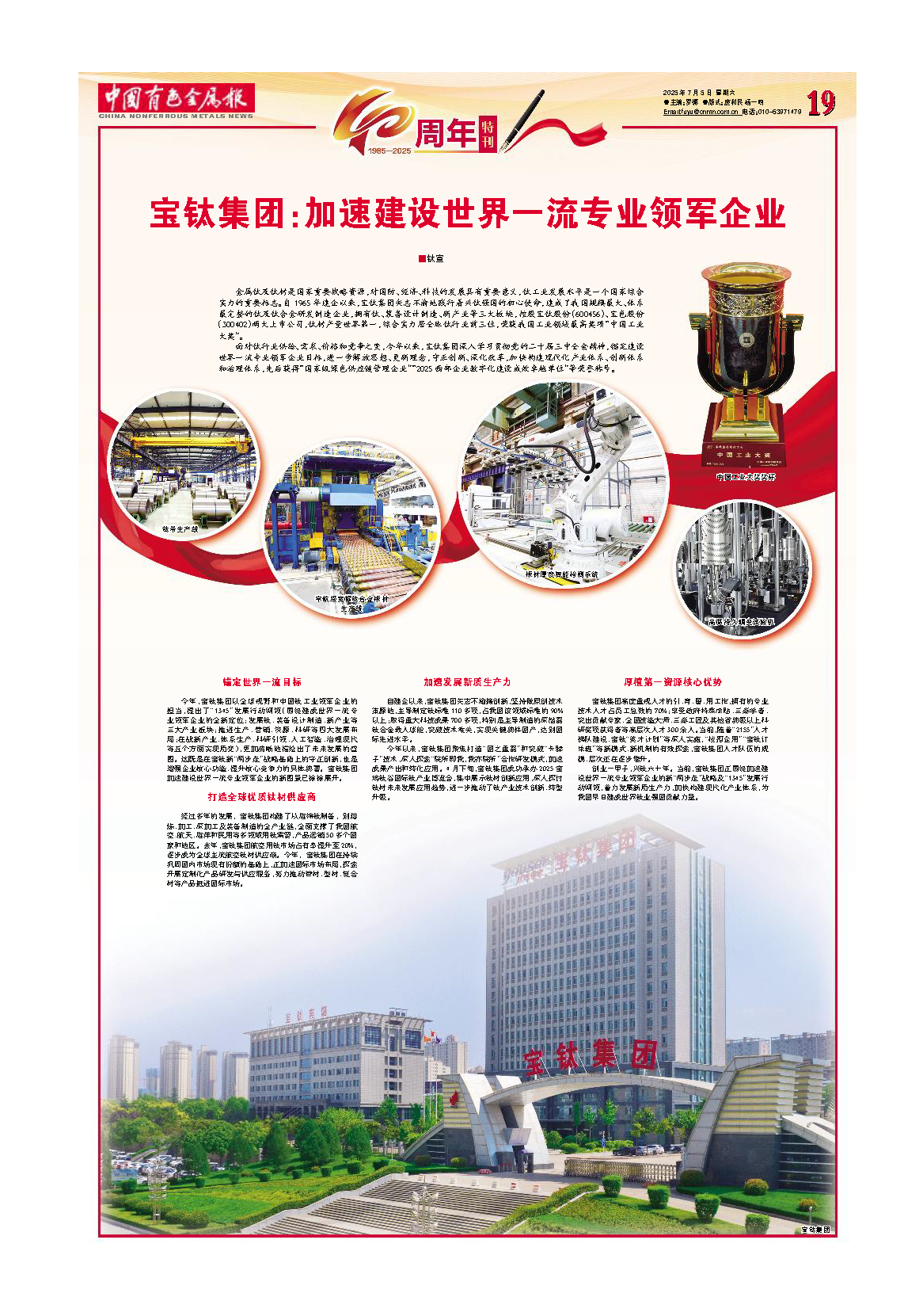 創(chuàng)業(yè)一甲子,興鈦六十年。當(dāng)前,寶鈦集團(tuán)正圍繞加速建設(shè)世界一流專業(yè)領(lǐng)軍企業(yè)的新“兩步走”戰(zhàn)略及“1345”發(fā)展行動(dòng)綱領(lǐng),著力發(fā)展新質(zhì)生產(chǎn)力,加快構(gòu)建現(xiàn)代化產(chǎn)業(yè)體系,為我國(guó)早日建成世界鈦業(yè)強(qiáng)國(guó)貢獻(xiàn)力量。