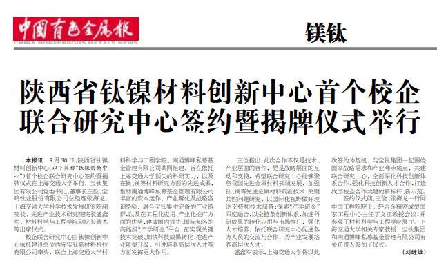 8月30日,陜西省鈦鎳材料創(chuàng)新中心(以下簡(jiǎn)稱“鈦鎳創(chuàng)新中心”)首個(gè)校企聯(lián)合研究中心簽約暨揭牌儀式在上海交通大學(xué)舉行。寶鈦集團(tuán)有限公司黨委書記、董事長(zhǎng)王儉,寶雞鈦業(yè)股份有限公司總經(jīng)理張海龍,上海交通大學(xué)科學(xué)技術(shù)發(fā)展研究院副院長(zhǎng)、先進(jìn)產(chǎn)業(yè)技術(shù)研究院院長(zhǎng)盛鑫軍,材料科學(xué)與工程學(xué)院副院長(zhǎng)董杰等出席儀式