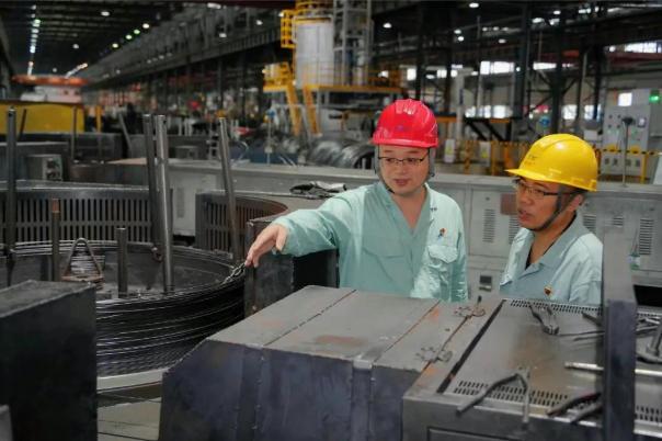 寶鈦集團(tuán)線材廠黨員骨干在生產(chǎn)一線與操作人員研究解決方案