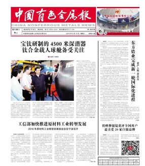 2016年6月1日~7日,由陜西有色集團下屬寶鈦集團研制的4500米深潛器鈦合金載人球艙,參加了主題為“創(chuàng)新驅動發(fā)展、科技引領未來”的國家“十二五”科技創(chuàng)新成就展,習近平總書記、李克強總理等黨和國家領導人參觀了展覽,并對寶鈦研制的深潛器鈦合金載人球艙給予充分肯定,并提出殷切希望。國家領導人到展臺來參觀和對企業(yè)的勉勵,讓有色行業(yè)、鈦行業(yè),尤其是寶鈦人群情激奮、備感自豪,這也是對寶鈦科技創(chuàng)新及中國鈦工業(yè)發(fā)展的巨大鼓舞。