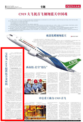 鈦合金材料首選供應(yīng)商。中國商飛對C919商用大飛機(jī)用鈦合金材料或部件,采用世界商用飛機(jī)通用的全球采購模式。在確定國內(nèi)鈦合金材料首選供應(yīng)商的過程中,商飛將目光投向了有著多年合作經(jīng)驗,世界第四大鈦及鈦合金材料生產(chǎn)制造商、國內(nèi)最大的鈦材加工企業(yè)——寶鈦集團(tuán)有限公司。中國商飛選擇寶鈦集團(tuán)最主要的原因是寶鈦集團(tuán)不僅是我國最早致力于鈦合金材料研究的單位,而且是國內(nèi)掌握鈦合金材料制備關(guān)鍵技術(shù)的龍頭企業(yè),擁有雄厚的科研、技術(shù)、裝備、人才等綜合實力。還與國內(nèi)著名高校、科研院所合作,承擔(dān)了我國眾多鈦合金材料研制及工程應(yīng)用研究項目,是國際著名航空航天器生產(chǎn)制造企業(yè)波音、空客、斯奈克瑪、古德里奇、龐巴迪、羅羅等的鈦材料合格供應(yīng)商和合作伙伴。寶鈦集團(tuán)秉承合作共贏的理念,從國產(chǎn)大型客機(jī)C919項目立項開始,就一直給予高度關(guān)注。中國商飛與寶鈦集團(tuán)一拍即合,寶鈦集團(tuán)籌建成立商用大飛機(jī)用鈦項目領(lǐng)導(dǎo)小組,并積極與商飛及其零部件制造商通力合作,滿足商飛供應(yīng)商管理和適航認(rèn)證要求,為C919大飛機(jī)提供了性能優(yōu)異的鈦合金材料,成為中國商飛大飛機(jī)國產(chǎn)化鈦合金材料的首選供應(yīng)商。