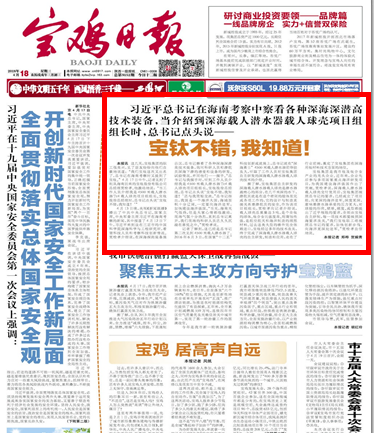 這幾天,寶鈦集團的職工很高興,見了朋友紛紛向他們自豪地說道:“我們寶鈦這次又出名了,總書記在海南考察時又提到了寶鈦?!?4月 17日中午,記者見到了剛從海南回來的寶鈦股份有限公司總經(jīng)理賈栓孝。他激動地說:“當工作人員介紹我是 4500米載人潛水器 Tc4載人球殼項目組組長、寶鈦股份總經(jīng)理時,總書記點頭說‘寶鈦不錯,我知道!’”