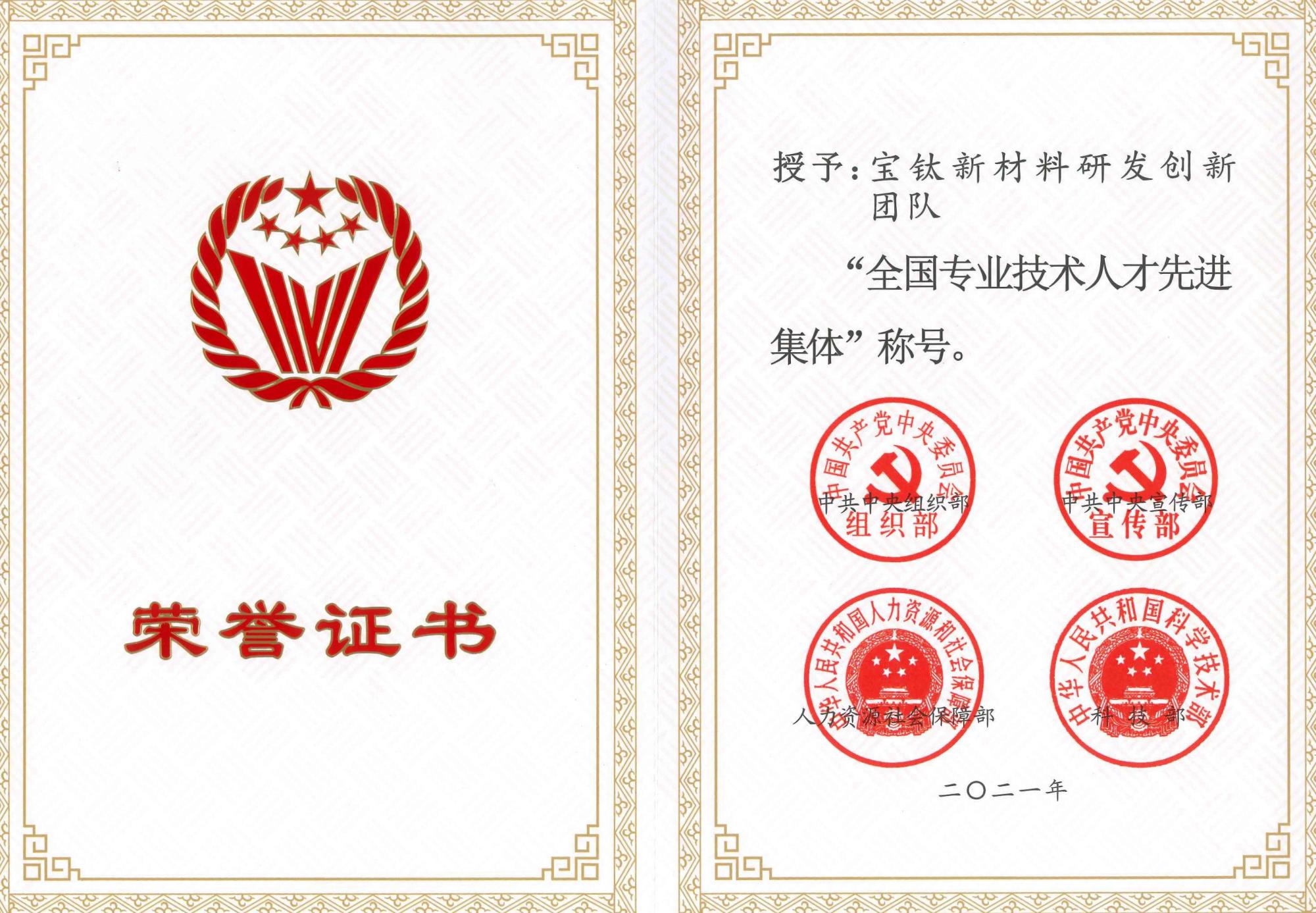 全國(guó)杰出專業(yè)技術(shù)人才及集體評(píng)選表彰由中共中央組織部、中共中央宣傳部、人力資源社會(huì)保障部、科技部聯(lián)合組織實(shí)施,每5年開(kāi)展一次。此次獲得表彰的全國(guó)專業(yè)技術(shù)人才先進(jìn)集體同時(shí)有鐘南山呼吸疾病防控團(tuán)隊(duì)、殲-15飛機(jī)研制團(tuán)隊(duì)等杰出人才集體,均為我國(guó)廣大專業(yè)技術(shù)人才的優(yōu)秀代表。2021年5月,在省人社廳、省國(guó)資委大力支持下,由陜西有色金屬集團(tuán)組織申報(bào),寶鈦新材料研發(fā)創(chuàng)新團(tuán)隊(duì)與全省眾多優(yōu)秀企業(yè)科研團(tuán)隊(duì)同臺(tái)競(jìng)爭(zhēng),經(jīng)過(guò)艱苦努力,沖出重圍,取得代表全省企業(yè)參與國(guó)家評(píng)選的唯一名額,最終在國(guó)家四部委聯(lián)合評(píng)選中脫穎而出。