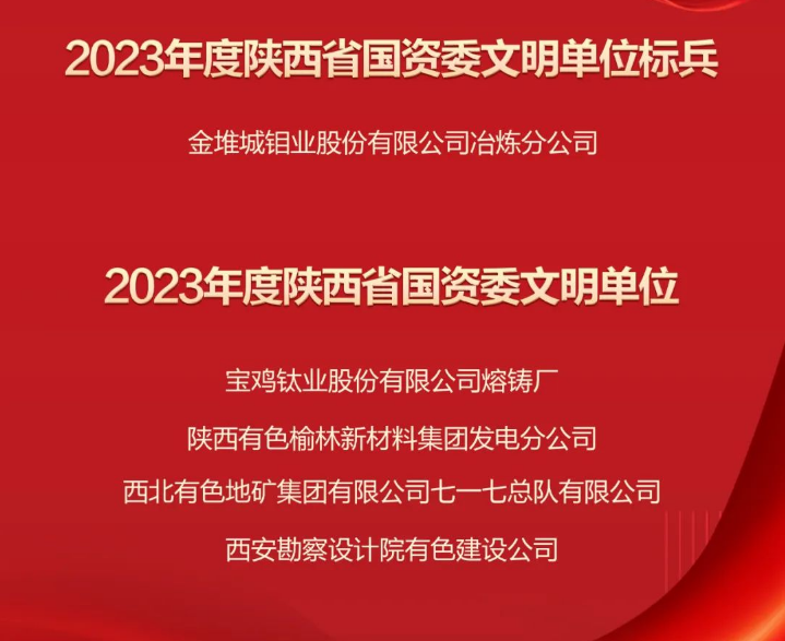 近日,陜西省國資委黨委命名表彰了2023年度陜西省國有企業(yè)文明單位(標(biāo)兵),陜西有色金屬集團(tuán)5家單位上榜。其中,金堆城鉬業(yè)股份有限公司冶煉分公司榮獲“2023年度陜西省國資委文明單位標(biāo)兵”稱號(hào),寶雞鈦業(yè)股份有限公司熔鑄廠、陜西有色榆林新材料集團(tuán)發(fā)電分公司榮獲“2023年度陜西省國資委文明單位”稱號(hào),西北有色地礦集團(tuán)有限公司七一七總隊(duì)有限公司、西安勘察設(shè)計(jì)院有色建設(shè)公司通過復(fù)審繼續(xù)保留“陜西省國資委文明單位”稱號(hào)。