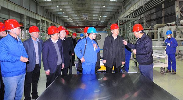 當(dāng)天下午,趙剛一行來到位于西安高新區(qū)錦業(yè)一路的鉬金屬工業(yè)園,現(xiàn)場(chǎng)參觀考察鉬產(chǎn)業(yè)發(fā)展,與集團(tuán)公司領(lǐng)導(dǎo)班子進(jìn)行座談。在馬寶平、鄒武裝、程方方,金鉬股份總經(jīng)理?xiàng)顕?guó)平等人陪同下,趙剛首先參觀了公司鉬產(chǎn)業(yè)布局示意沙盤,走進(jìn)金鉬股份展廳,聽取了馬寶平對(duì)公司概況、主要產(chǎn)品、發(fā)展成就介紹。隨后,他深入鉬粉分廠和板材事業(yè)部,仔細(xì)參觀、詢問了氧化鉬、鉬爐料及鉬板坯等鉬制品生產(chǎn)線的工藝流程、產(chǎn)品應(yīng)用等情況,對(duì)公司在我國(guó)鉬行業(yè)取得的領(lǐng)先地位和作出的突出貢獻(xiàn)表示贊賞。