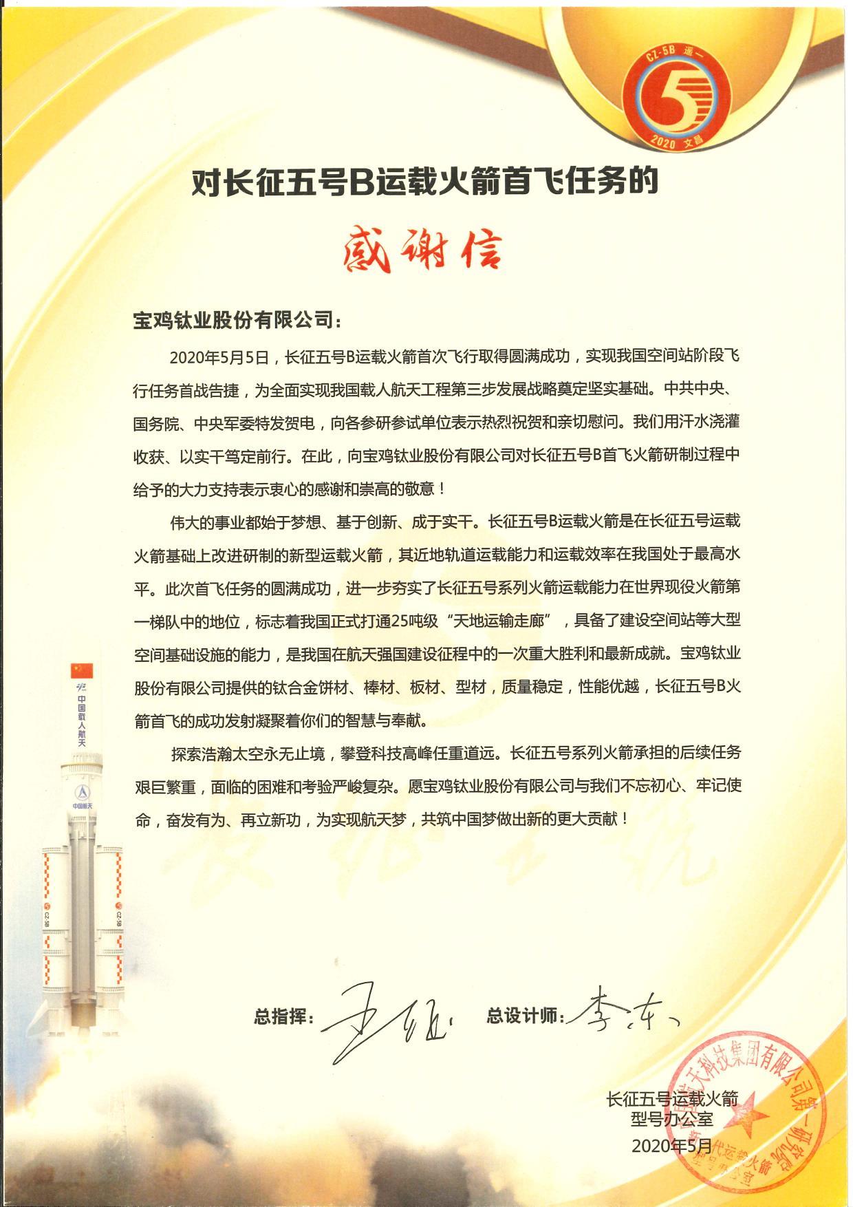 近日,寶鈦股份收到長征五號B運載火箭首飛任務的感謝信。寶鈦股份為長征五號B運載火箭提供的鈦合金餅材、棒材、板材、型材,質(zhì)量穩(wěn)定,性能優(yōu)越,受到客戶極大的肯定。