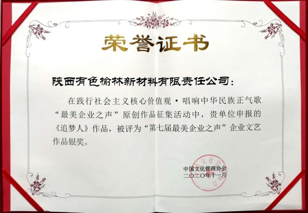 會上,榆林新材料集團選送的企業(yè)之歌MV《追夢人》被評選為中國文化管理協(xié)會第七屆最美企業(yè)之聲“企業(yè)文藝作品”銀獎;《企業(yè)形象宣傳片》被評為第七屆最美企業(yè)之聲“最美形象之聲”優(yōu)秀代言作品。