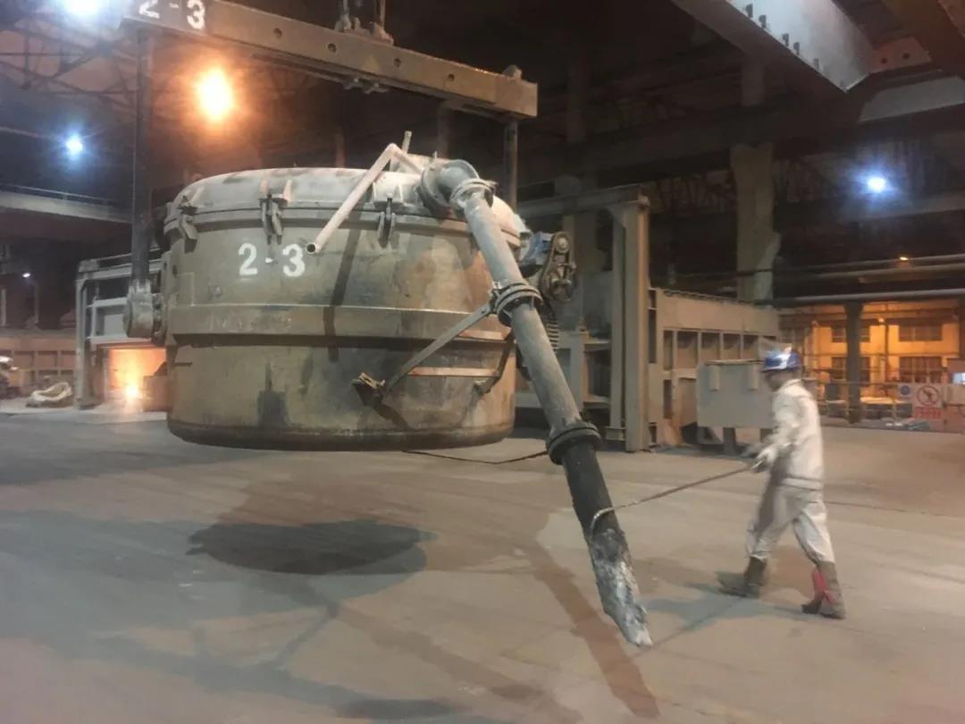 特種車(chē)輛把散發(fā)著高溫的鋁液裝在一個(gè)圓形的抬包里,用天車(chē)吊起,將通紅的鋁水倒在冷卻槽里。工人冒著高溫將浮在鋁液上邊的雜質(zhì)清理掉,讓鋁液流到一個(gè)個(gè)模具之中,鏈條傳動(dòng),一塊塊呈亮的鋁錠被打上生廠日期和生產(chǎn)編碼整整齊齊地碼放在車(chē)間的一角。