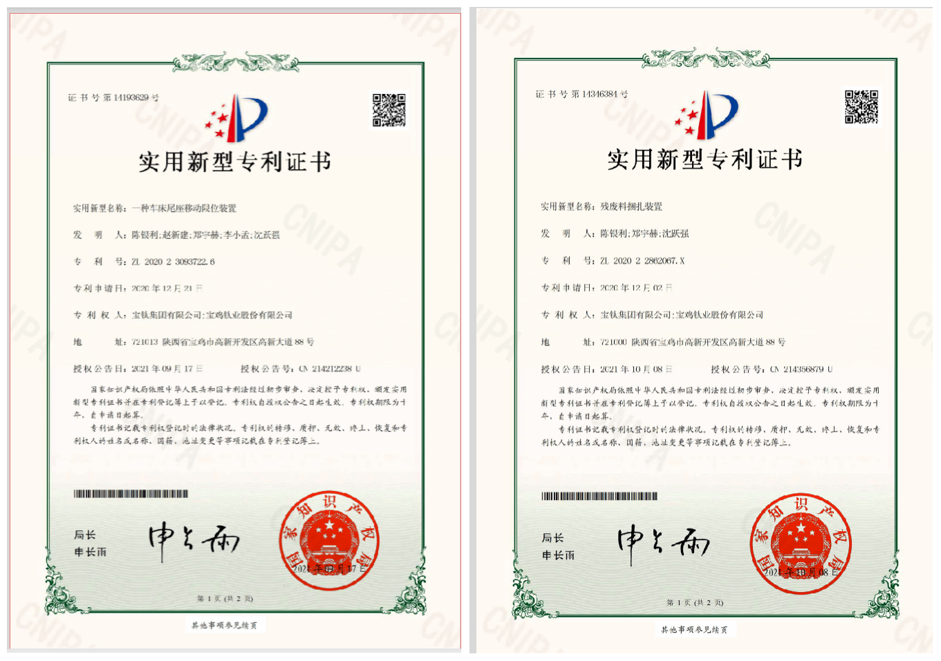 近日,寶鈦集團(tuán)原料廠自主研發(fā)的《殘廢料捆扎裝置》和《一種車床尾座移動(dòng)限位裝置》研究改造成果成功獲得國家實(shí)用新型專利的授權(quán),并取得專利證書。