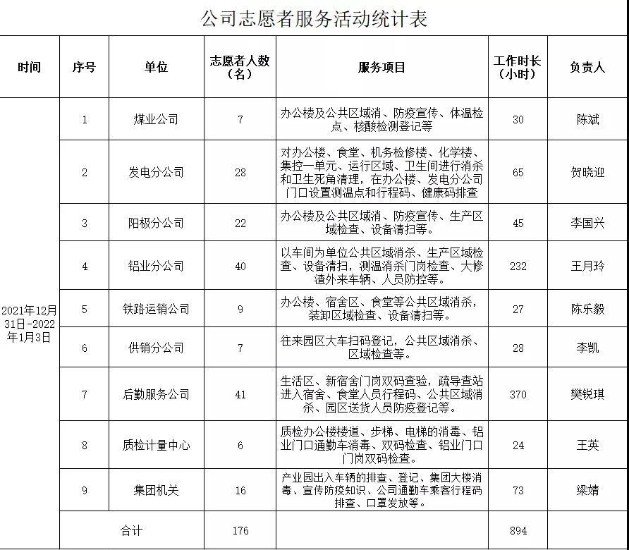 “凝聚青春正能量,眾志成城抗疫情”。元旦期間公司團(tuán)委“抗疫情,穩(wěn)生產(chǎn)”志愿者服務(wù)活動(dòng),共有176名志愿者參與,開展志愿者服務(wù)活動(dòng)項(xiàng)目十余項(xiàng),累計(jì)服務(wù)時(shí)長(zhǎng)約894小時(shí)。公司志愿服務(wù)工作仍在繼續(xù),廣大團(tuán)員青年仍將繼續(xù)堅(jiān)守。疫情防控,人人有責(zé),請(qǐng)廣大職工朋友做好自我防護(hù),配合公司做好疫情防控各項(xiàng)工作,凝心聚力、眾志成城、共同構(gòu)筑牢固防疫屏障,為公司疫情防控和安全穩(wěn)定生產(chǎn)做出新的更大貢獻(xiàn)。
