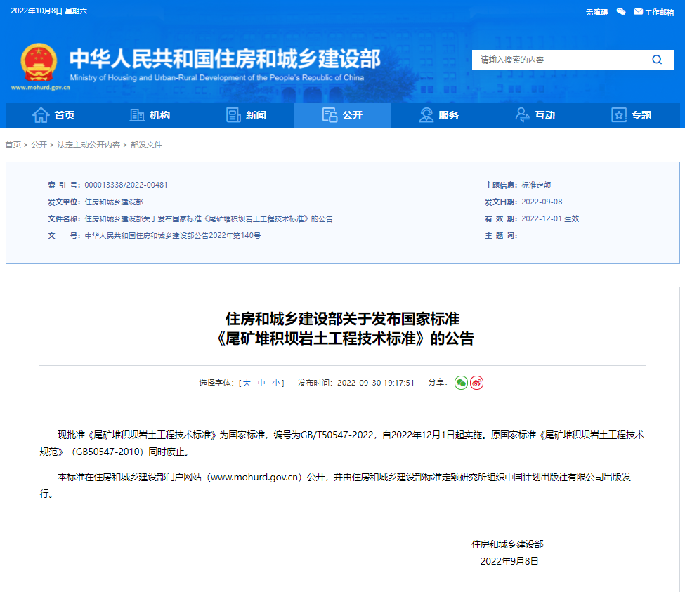 近日,住房和城鄉(xiāng)建設(shè)部發(fā)布2022年第140號公告,西安勘察設(shè)計院主編的國家標(biāo)準(zhǔn)《尾礦堆積壩巖土工程技術(shù)標(biāo)準(zhǔn)》GB/T 50547-2022獲批發(fā)布,將于2022年12月1日起實(shí)施。
