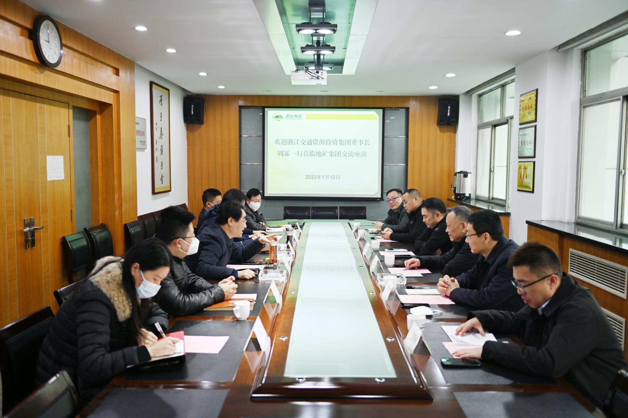 1月12日,浙江交通資源投資集團(tuán)有限公司(以下簡(jiǎn)稱資源公司)董事長(zhǎng)周霖一行到訪地礦集團(tuán),圍繞“深化合作交流、攜手共促發(fā)展”進(jìn)行交流座談,共同展望新年新前景,為雙方強(qiáng)強(qiáng)聯(lián)合推進(jìn)項(xiàng)目合作開好頭、起好步。地礦集團(tuán)黨委書記、董事長(zhǎng)秦西社出席座談會(huì),黨委副書記、總經(jīng)理高菊生及有關(guān)部門負(fù)責(zé)人參加座談。
