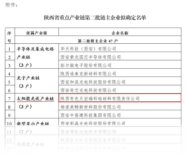 2023年6月6日,陜西省工業(yè)和信息化廳對(duì)陜西省重點(diǎn)產(chǎn)業(yè)鏈第二批鏈主企業(yè)擬確定名單進(jìn)行了公示,陜西有色天宏瑞科硅材料有限責(zé)任公司成功入選太陽能光伏產(chǎn)業(yè)鏈鏈主企業(yè)。