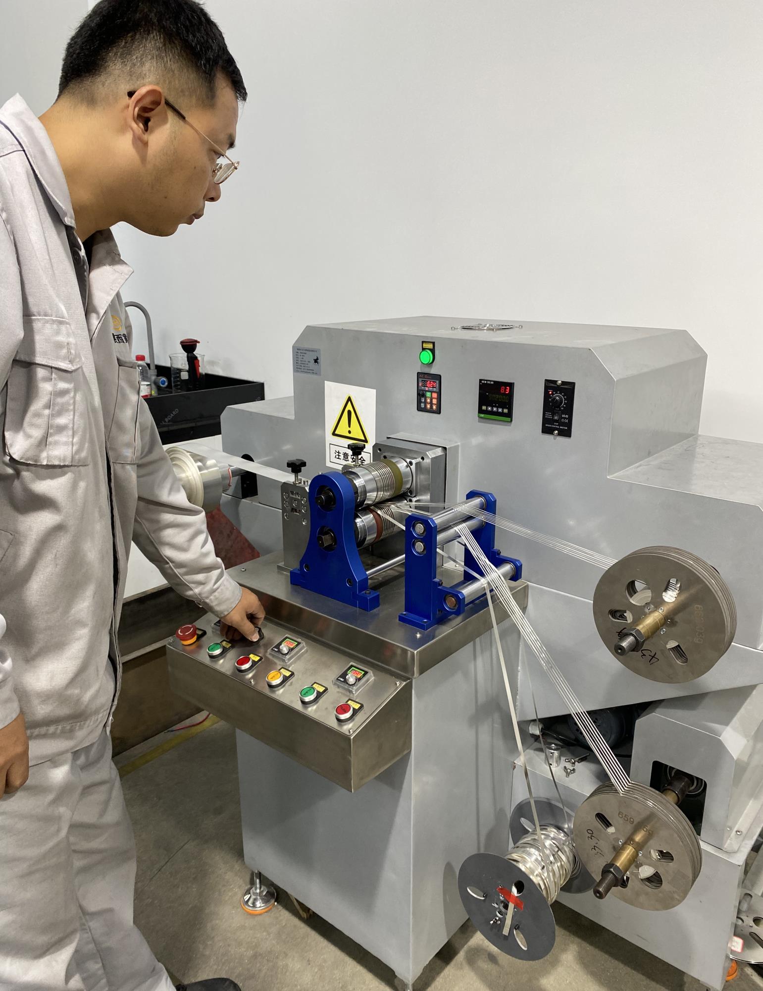 銀帶分條機(jī)正在對(duì)銀片進(jìn)行多道剪裁