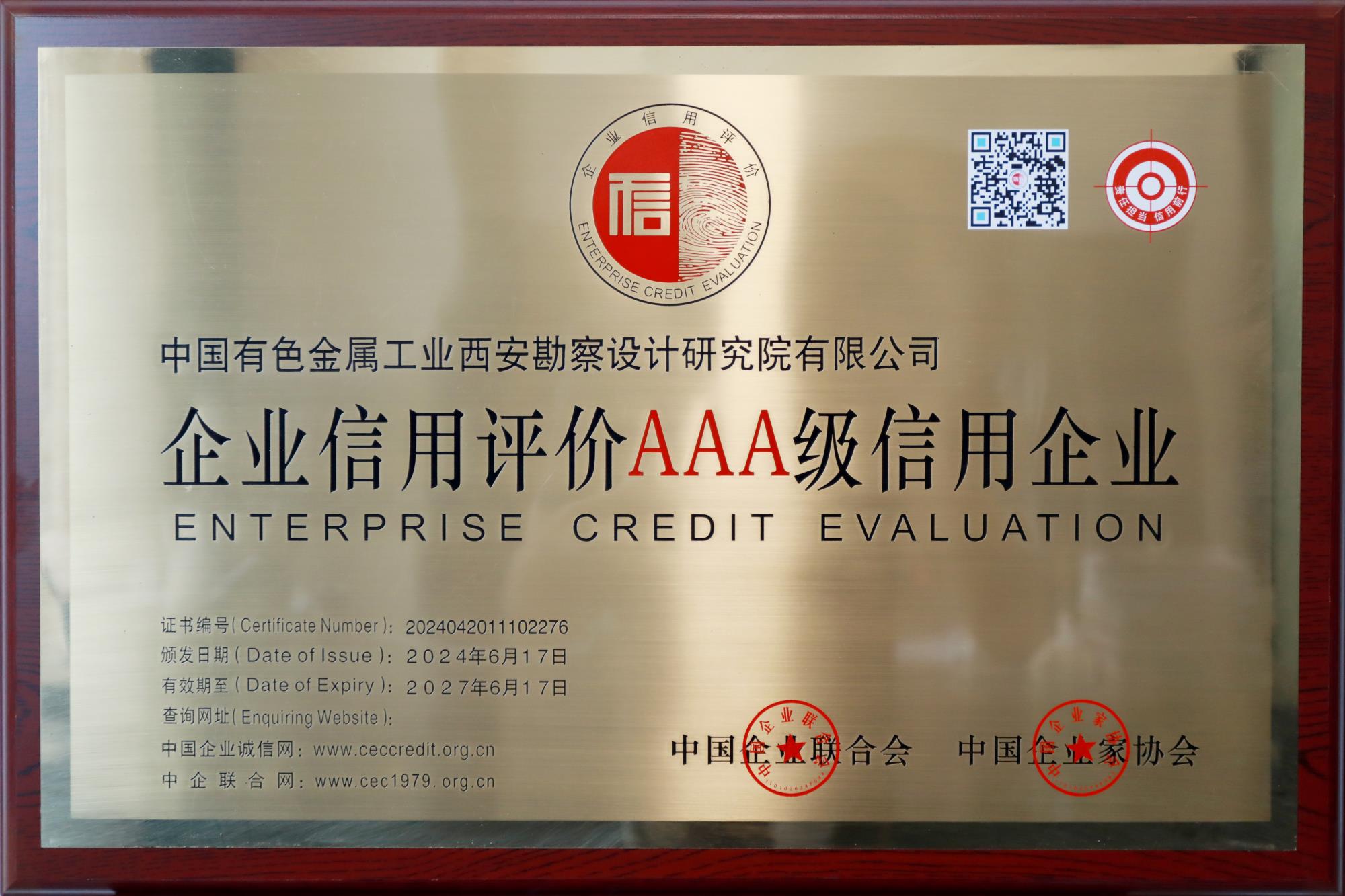 近日,西安勘察設(shè)計(jì)院榮獲由中國企業(yè)聯(lián)合會(huì)和中國企業(yè)家協(xié)會(huì)頒發(fā)的2024年企業(yè)信用評(píng)價(jià)AAA級(jí)信用企業(yè)稱號(hào),為國家企業(yè)信用評(píng)價(jià)最高等級(jí)。