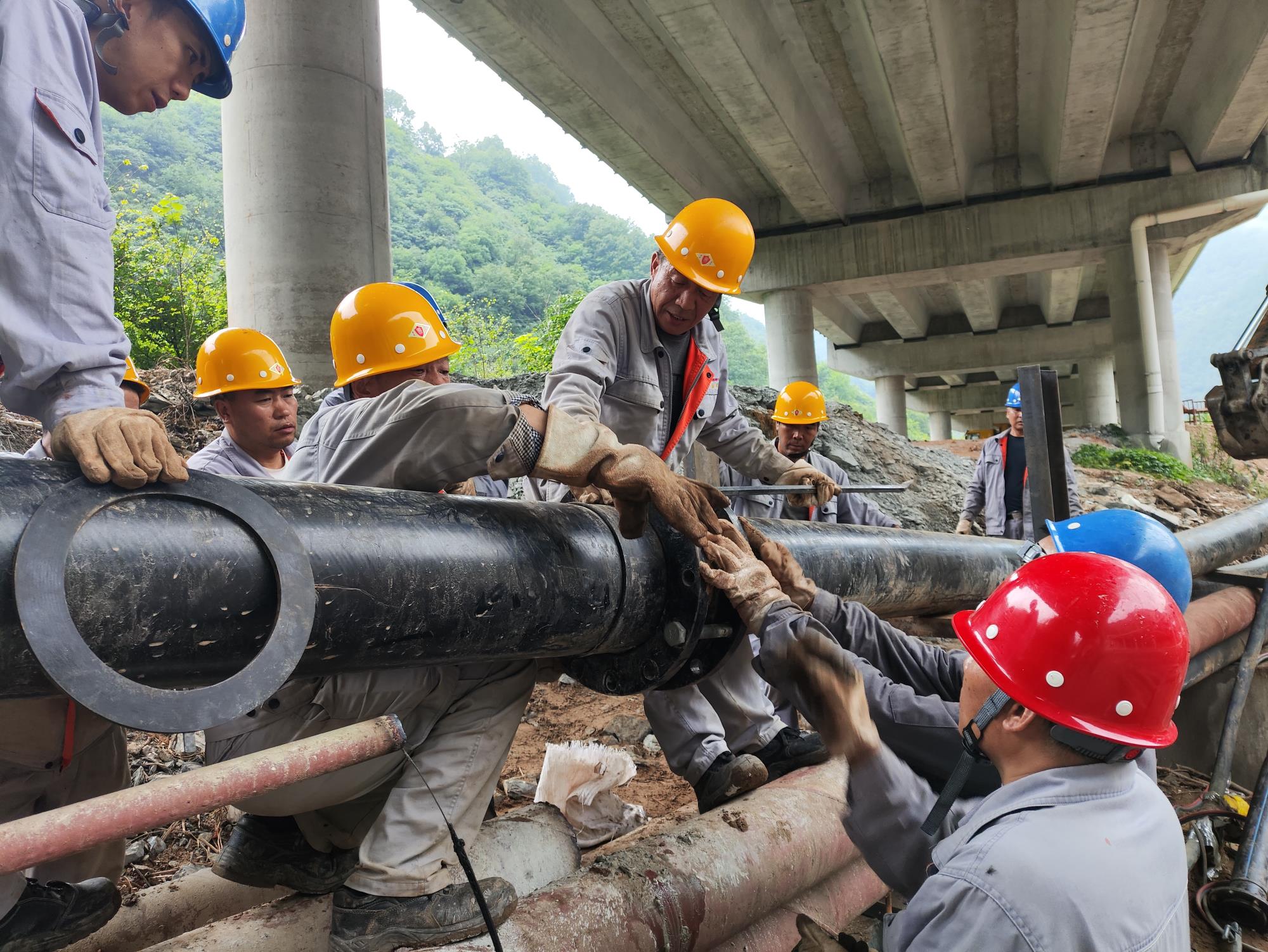 7月16日,四方金礦職工正在架設(shè)被洪水沖毀的尾礦管道。