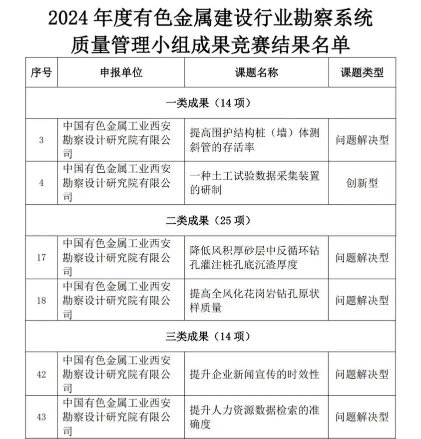近日,中國有色金屬建設(shè)協(xié)會公布了2024年度有色建設(shè)行業(yè)勘察系統(tǒng)質(zhì)量管理小組成果競賽活動(部級)獲獎項目名單,西安勘察設(shè)計院組織申報的《提高圍護結(jié)構(gòu)樁(墻)體測斜管的存活率》《一種土工試驗數(shù)據(jù)采集裝置的研制》等6項成果,分獲一、二、三獎。