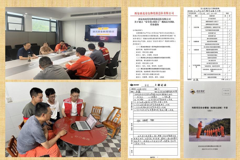在“湖北省引江補(bǔ)漢地空瞬變電磁物探項(xiàng)目”中,現(xiàn)場(chǎng)安全團(tuán)隊(duì)按照公司“安全員+崗位工”建設(shè)方案,結(jié)合《地勘項(xiàng)目安全管理<標(biāo)準(zhǔn)化定制手冊(cè)>》《員工安全手冊(cè)》等文件要求,堅(jiān)持以制度規(guī)范管流動(dòng)項(xiàng)目、以標(biāo)準(zhǔn)流程管現(xiàn)場(chǎng)作業(yè)、以考核評(píng)價(jià)管人員行為,從項(xiàng)目前培訓(xùn)、上崗前教育、飛行前交底、收工前總結(jié)等方面,打造了一套“菜單式”安全管理模式。項(xiàng)目部嚴(yán)格落實(shí)“一崗兩清單”,負(fù)責(zé)人兼安全員與隊(duì)員逐一簽訂責(zé)任書(shū),利用“一文件一主題”每日班前會(huì)、“袖標(biāo)+紅馬甲”、“手指口述”等形式,規(guī)范推行安全標(biāo)準(zhǔn)化管理。面對(duì)無(wú)人機(jī)新領(lǐng)域的安全風(fēng)險(xiǎn),項(xiàng)目部認(rèn)真學(xué)習(xí)地勘測(cè)繪行業(yè)安全生產(chǎn)指引和無(wú)人機(jī)風(fēng)險(xiǎn)隱患判定等規(guī)范,聚焦野外踏勘、儀器校驗(yàn)、測(cè)量放線、無(wú)人機(jī)航測(cè)、設(shè)備維保等工序,深入開(kāi)展新場(chǎng)景下的風(fēng)險(xiǎn)辨識(shí)、應(yīng)急演練和隱患排查治理,確保安全風(fēng)險(xiǎn)可控、隱患閉環(huán)管理。
