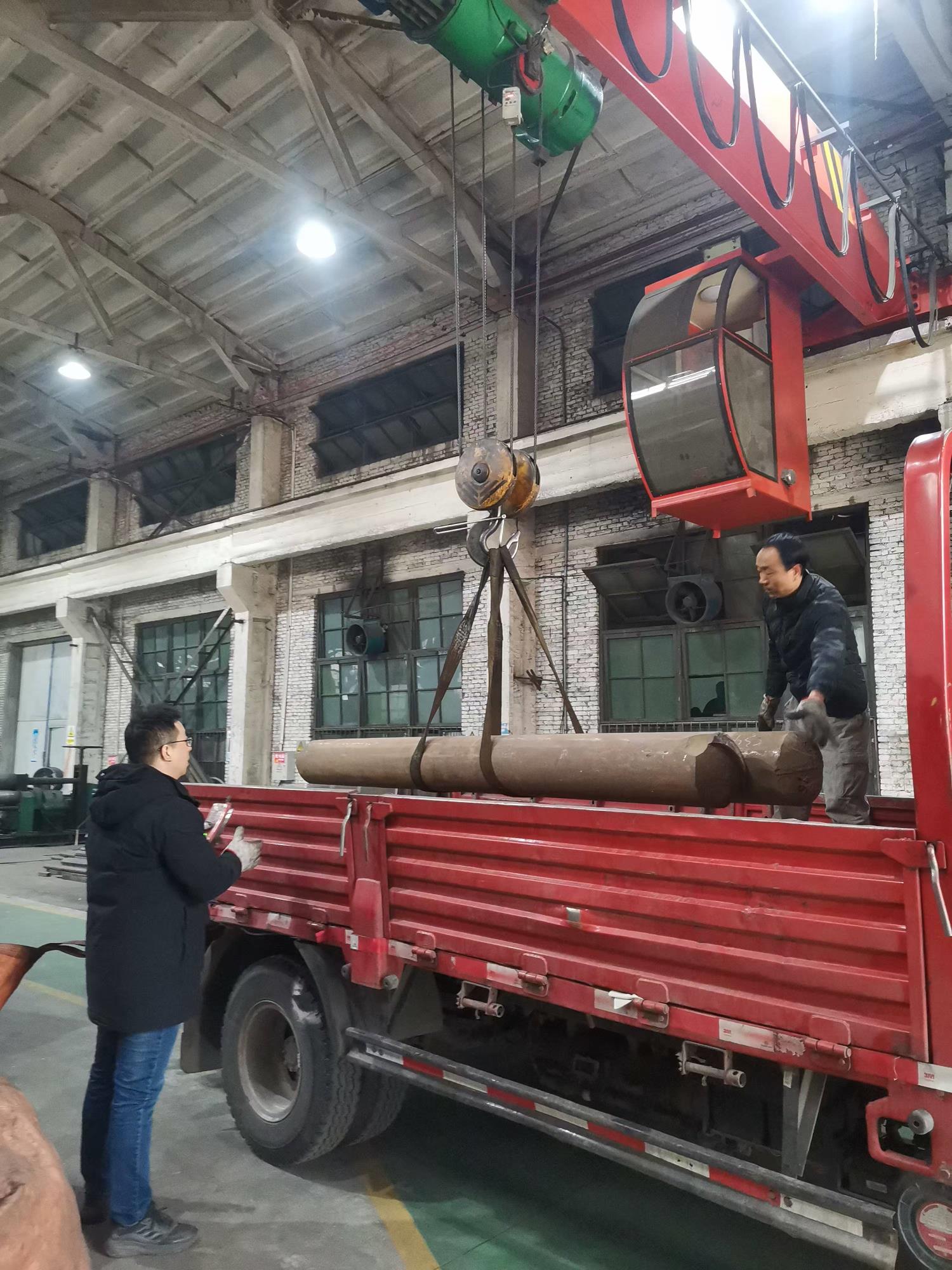 2月1日(正月初四),機(jī)械院金工車(chē)間調(diào)度金煒與司機(jī)惠海龍吊裝鈦棒。
