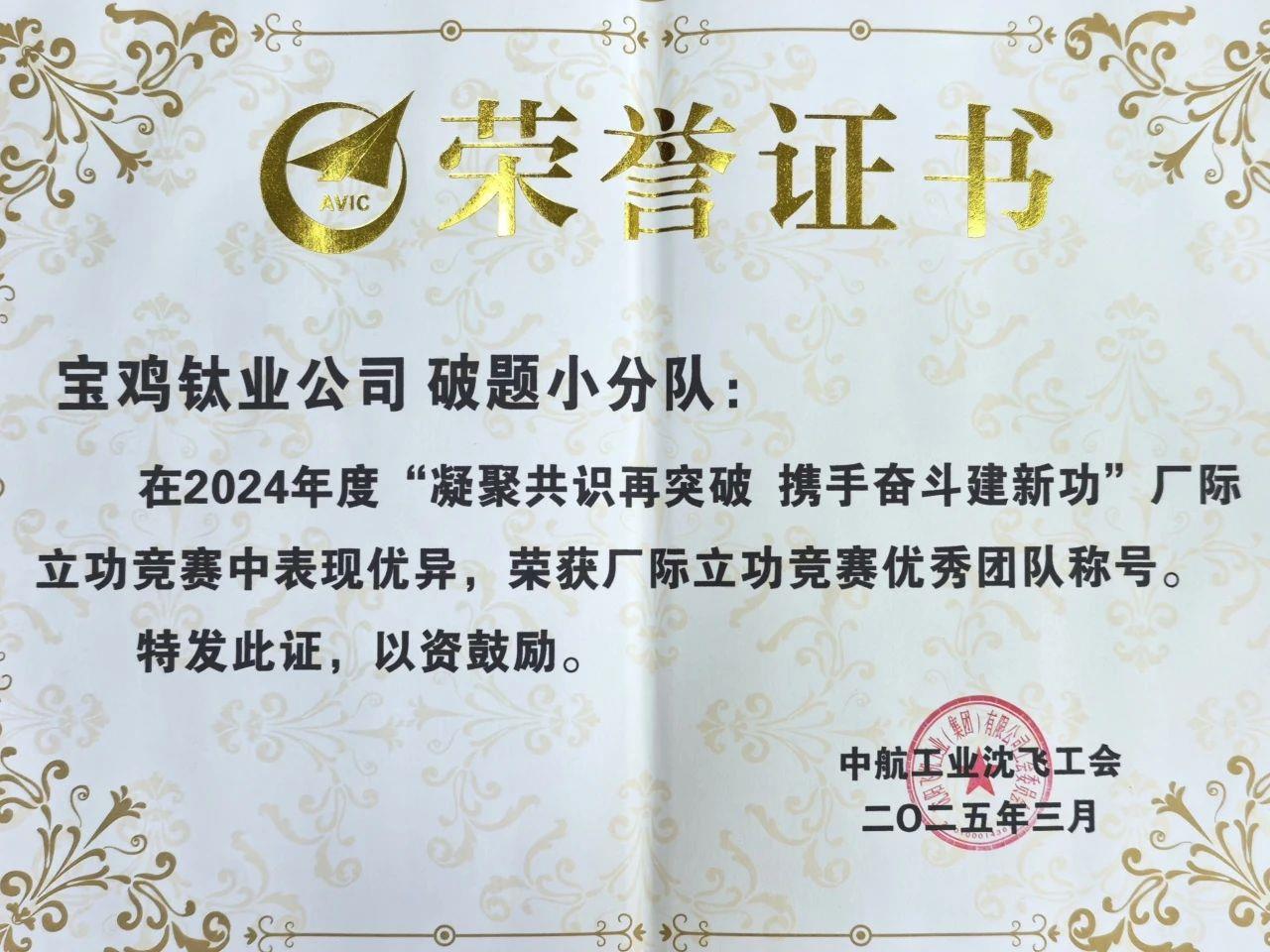 近日,在沈陽(yáng)飛機(jī)工業(yè)(集團(tuán))有限公司工會(huì)揭曉的2024年度“凝聚共識(shí)再突破 攜手奮斗建新功”廠際立功競(jìng)賽獲獎(jiǎng)名單中,寶鈦股份以卓越表現(xiàn)獲得多個(gè)獎(jiǎng)項(xiàng):寶鈦股份榮獲“表?yè)P(yáng)單位”稱(chēng)號(hào),寶鈦股份王勤波帶領(lǐng)的破題小分隊(duì)榮獲“優(yōu)秀團(tuán)隊(duì)”稱(chēng)號(hào),寶鈦股份楊軍榮獲“先進(jìn)個(gè)人”稱(chēng)號(hào)。這不僅彰顯了寶鈦股份在航空鈦材領(lǐng)域的全鏈條服務(wù)能力,更標(biāo)志著寶鈦股份與航空工業(yè)鏈主企業(yè)的戰(zhàn)略協(xié)作邁上了新臺(tái)階。