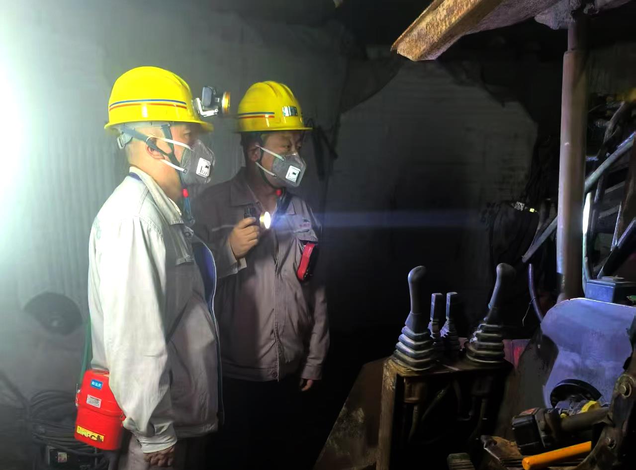 王鑫(右)正在對(duì)井下設(shè)備進(jìn)行安全檢查