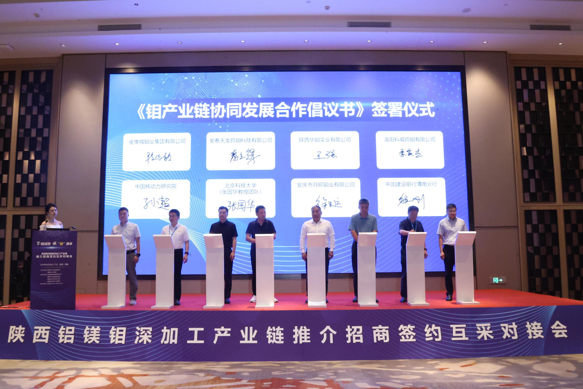 會上,渭南市華州區(qū)發(fā)布了鉬產業(yè)發(fā)展布局規(guī)劃,產業(yè)鏈相關合作銀行中國建設銀行陜西分行發(fā)布金融政策。由省鋁鎂鉬深加工產業(yè)鏈鏈主企業(yè)金鉬集團牽頭、聯合產業(yè)鏈上下游企業(yè)、科研院所、高校及金融機構共同發(fā)起簽署了《鉬產業(yè)鏈協同發(fā)展合作倡議書》。