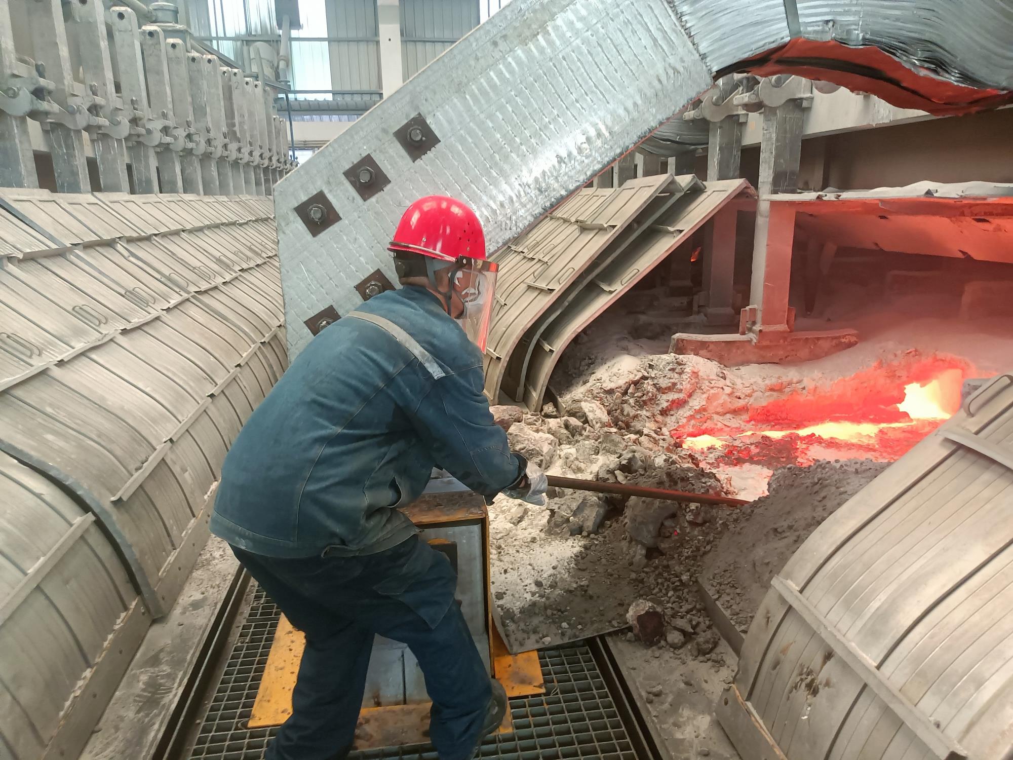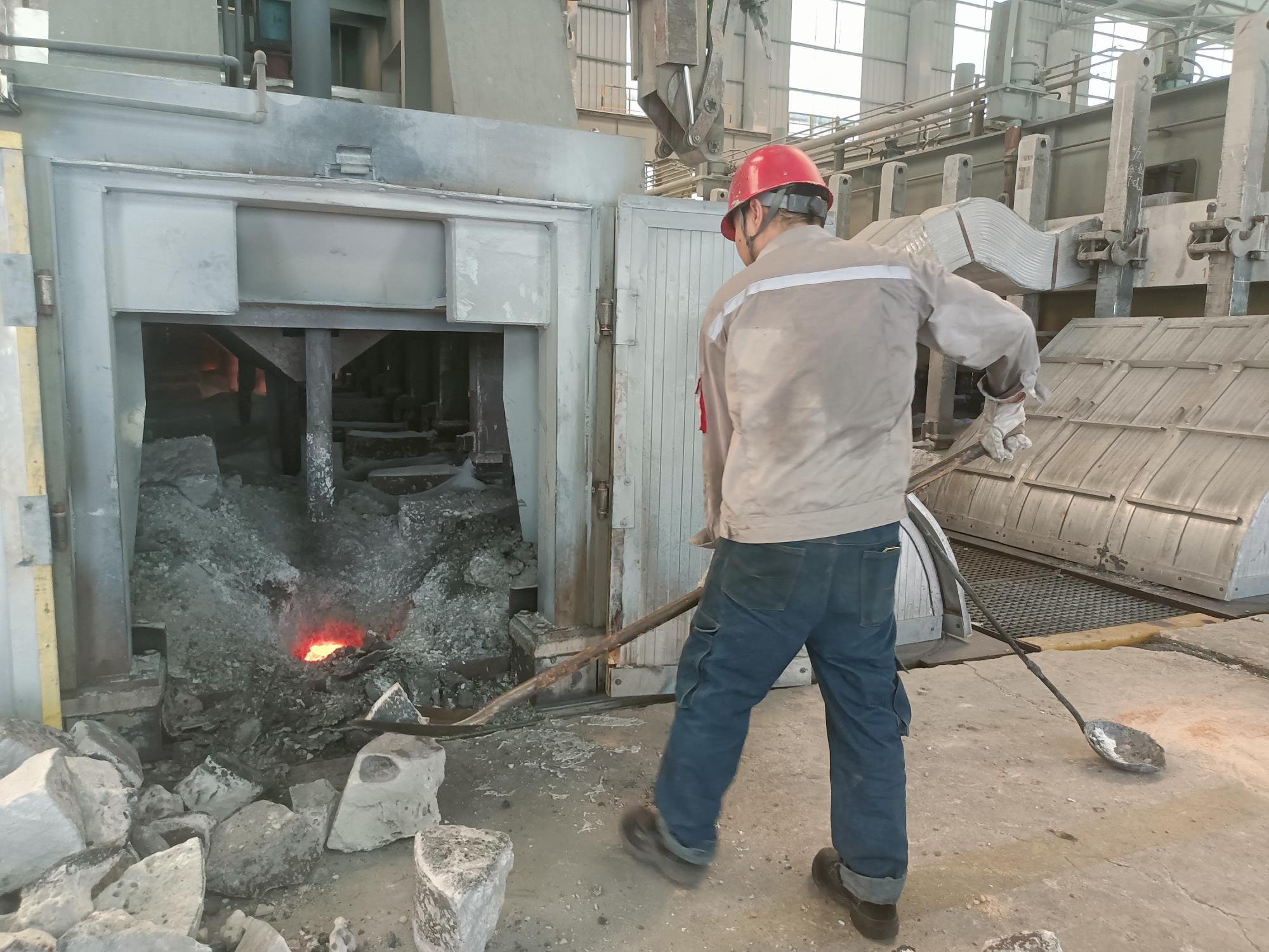 生產(chǎn)現(xiàn)場,500KA電解槽排列成陣,如同一條條沉默的鋼鐵巨龍,槽內(nèi)鋁液翻涌、發(fā)出低沉的嗡鳴。工人們身著厚厚的阻燃工作服、頭戴安全帽,汗水早已浸透衣背,在厚重的工裝上洇開大片深色鹽漬。每一次揮動鐵鍬,每一次認(rèn)真巡視,每一次記錄數(shù)據(jù),構(gòu)成一幅與高溫對抗的堅韌畫面。