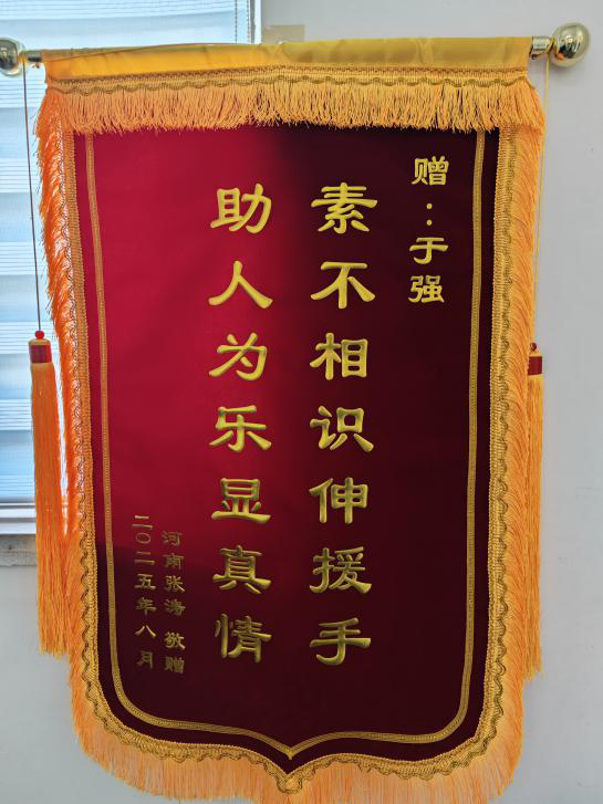 當(dāng)天下午14時(shí)許,原本平靜的海面暴雨驟至。安陽一家四口被猛烈的離岸流裹挾,迅速漂向深海。危急時(shí)刻,于強(qiáng)與三名游客不顧個(gè)人安危,毅然沖入滔天巨浪中展開救援。濁浪如墻,一次次將他們吞沒,但他們始終緊抓遇險(xiǎn)者,奮力抗?fàn)?。于?qiáng)在驚濤駭浪中死死抓住那位母親的游泳圈,拼盡全力向岸邊拖拽;其余三人則分別救起父親和兩名孩子。經(jīng)過近半小時(shí)的殊死搏斗,一家四口被平安送回岸邊。精疲力竭的于強(qiáng)在確認(rèn)被救者無礙后,默默離開了現(xiàn)場。近日,被救家屬將感謝信和錦旗送至于強(qiáng)所在單位寶鈦集團(tuán)動(dòng)力公司,他的英勇事跡才被眾人知曉。