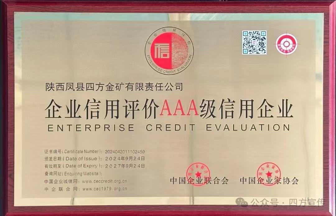 黃金集團(tuán)四方金礦再獲AAA級(jí)信用企業(yè)認(rèn)定