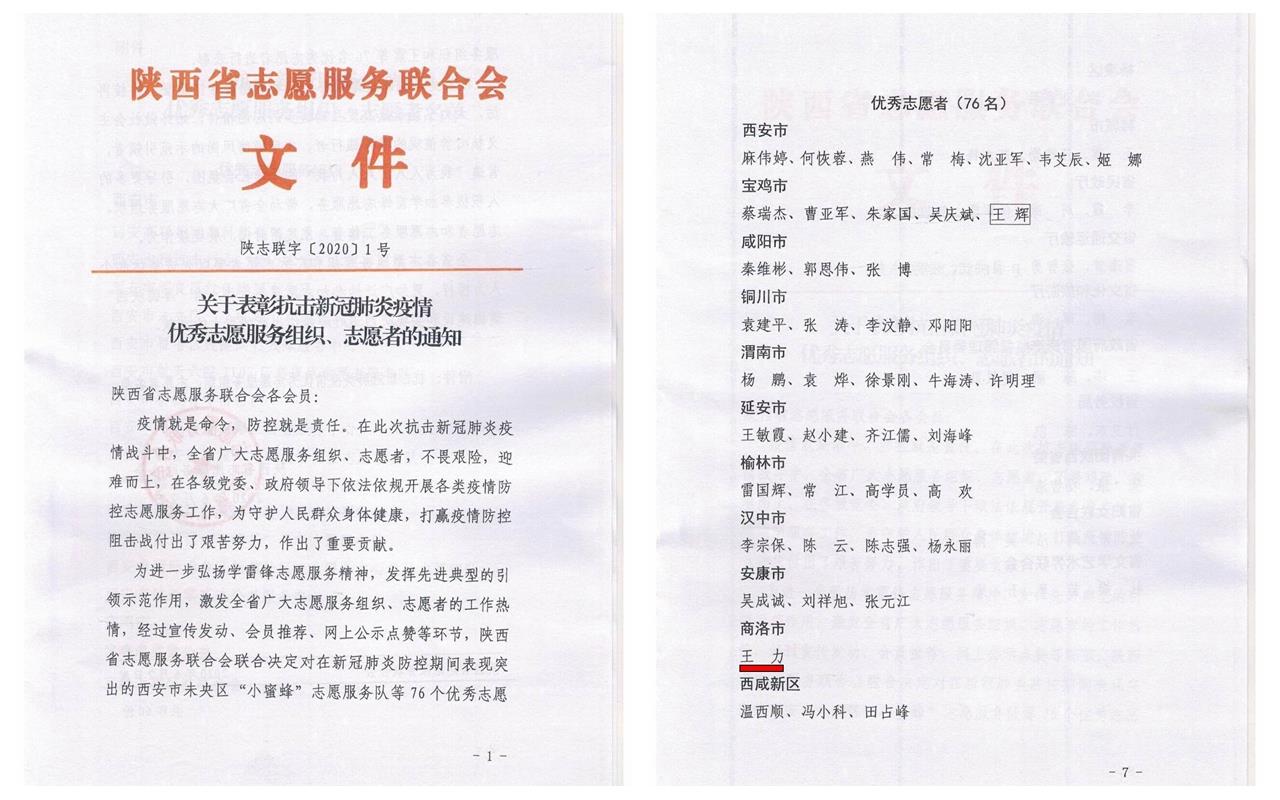 日前,陜西省志愿服務(wù)聯(lián)合會(huì)決定對在全省新冠肺炎疫情防控期間表現(xiàn)突出的76個(gè)優(yōu)秀志愿服務(wù)組織和76名優(yōu)秀志愿者進(jìn)行表彰。陜西五洲礦業(yè)股份有限公司黨員王力同志榮獲“陜西省抗疫優(yōu)秀志愿者”榮譽(yù)稱號(hào)。