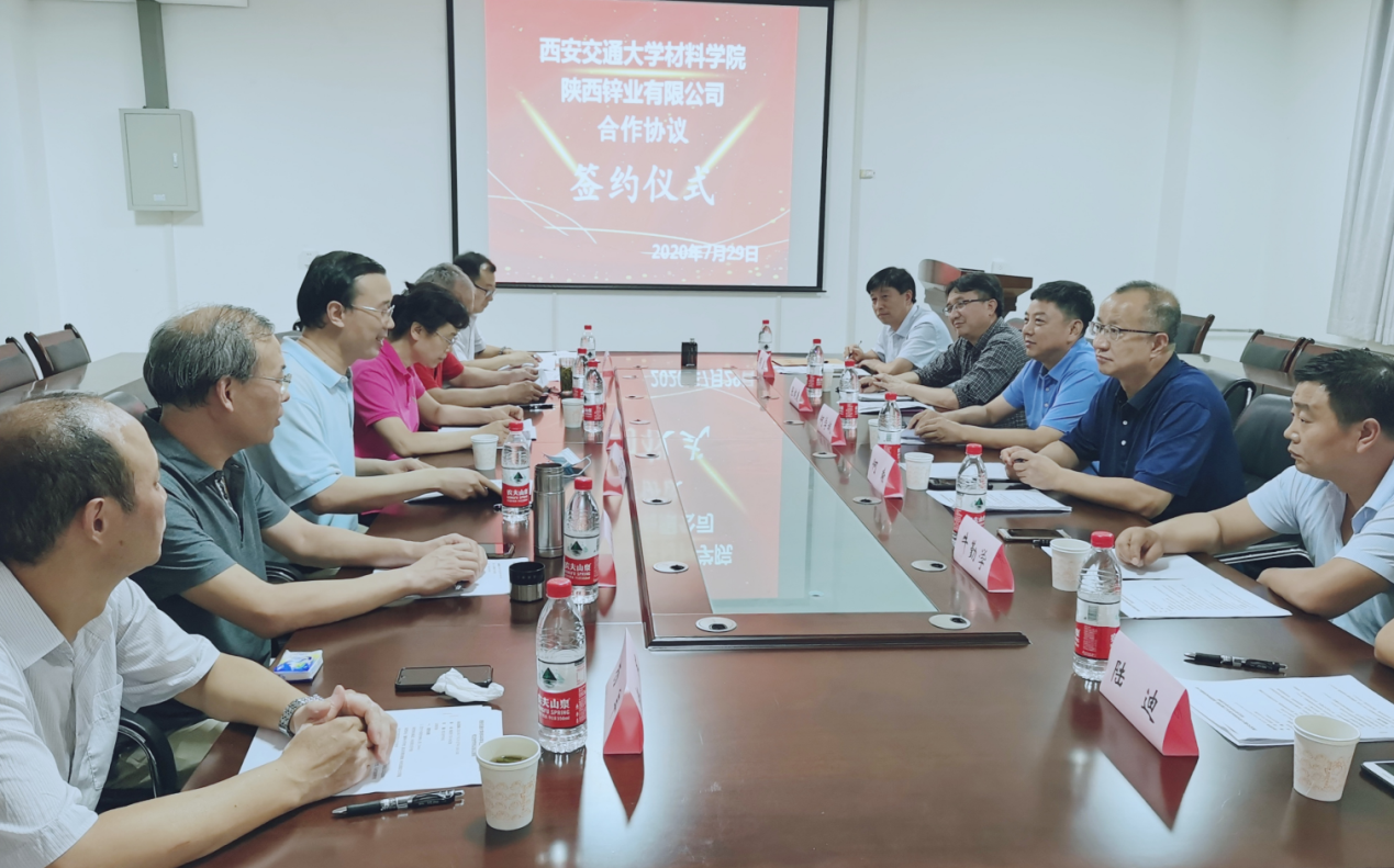 7月29日, 陜西鋅業(yè)有限公司與西安交通大學(xué)材料科學(xué)與工程學(xué)院召開校企合作座談會,并舉行校企合作簽約儀式。雙方就推動陜西鋅業(yè)鋅資源及鋅基合金新材料、新工藝、新產(chǎn)品的技術(shù)集成與產(chǎn)業(yè)鏈精深加工,按照“優(yōu)勢互補(bǔ)、資源共享、互惠互利、共贏發(fā)展”的原則,以企業(yè)委托課題形式開展相關(guān)鋅基新材料、新技術(shù)、新工藝研究,并以緊密性戰(zhàn)略聯(lián)盟的方式聯(lián)合參與相關(guān)重點(diǎn)、重大科研項目,通過校企合作,推動雙方共同發(fā)展。陜西有色金屬集團(tuán)科技部主任何瑜參加座談會并見證簽約儀式。