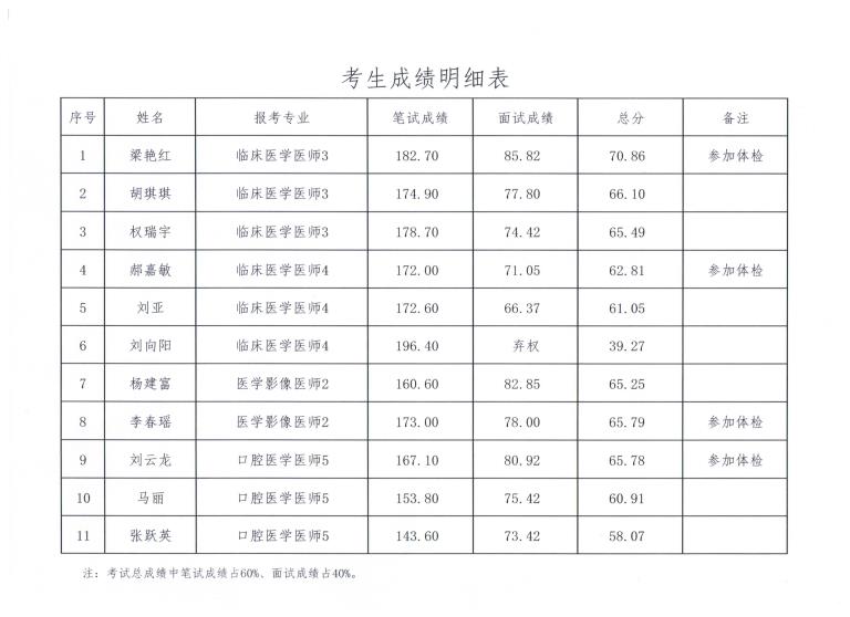 西北有色醫(yī)院2019年省屬事業(yè)單位公開招聘面試環(huán)節(jié)已經(jīng)結(jié)束,依據(jù)《事業(yè)單位人事管理條例》《陜西省事業(yè)單位公開招聘工作人員實施辦法》及2019年陜西省省屬事業(yè)單位公開招聘工作人員公告要求,考試總成績,按照與崗位招聘計劃11的比例從高分到低分確定參加體檢人員?,F(xiàn)將有關(guān)事項公告如下: