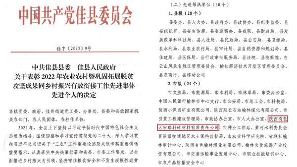 天瑞硅材料榮獲中共佳縣縣委、佳縣人民政府“縣級(jí)文明單位”、“先進(jìn)幫扶單位”表彰