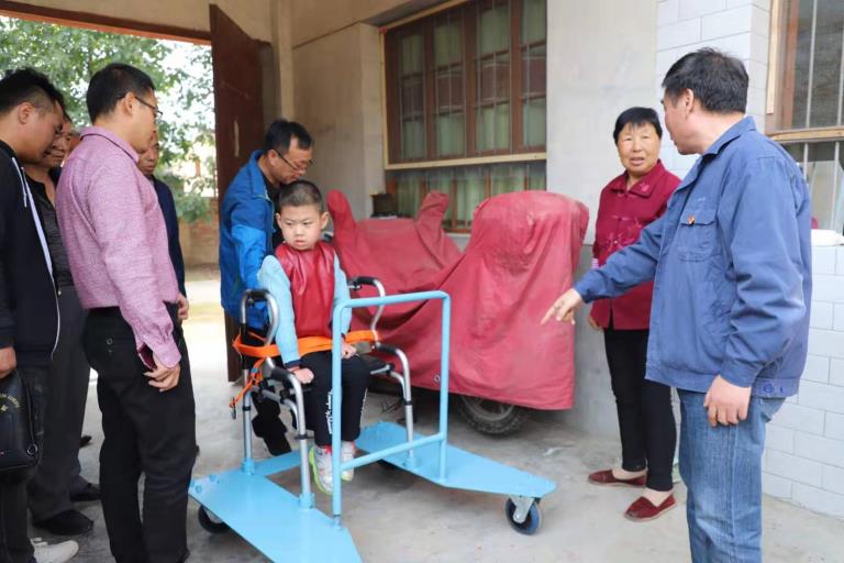 座談會后,一行人來到包聯(lián)貧困戶李海軍的家中,該戶家中9歲的孩子患有唐氏綜合癥不能獨立行走,讓這個貧困的家庭雪上加霜。駐村干部呂金輝早早發(fā)現(xiàn)了這一點,他利用休假回單位期間,特地為患病兒童制作了一輛“代步車”,此次連同慰問品一起送到了貧困戶李海軍家中,并現(xiàn)場為患病孩子做了“代步車”操作演示,樸實的村民激動的熱淚盈眶,連連感謝。