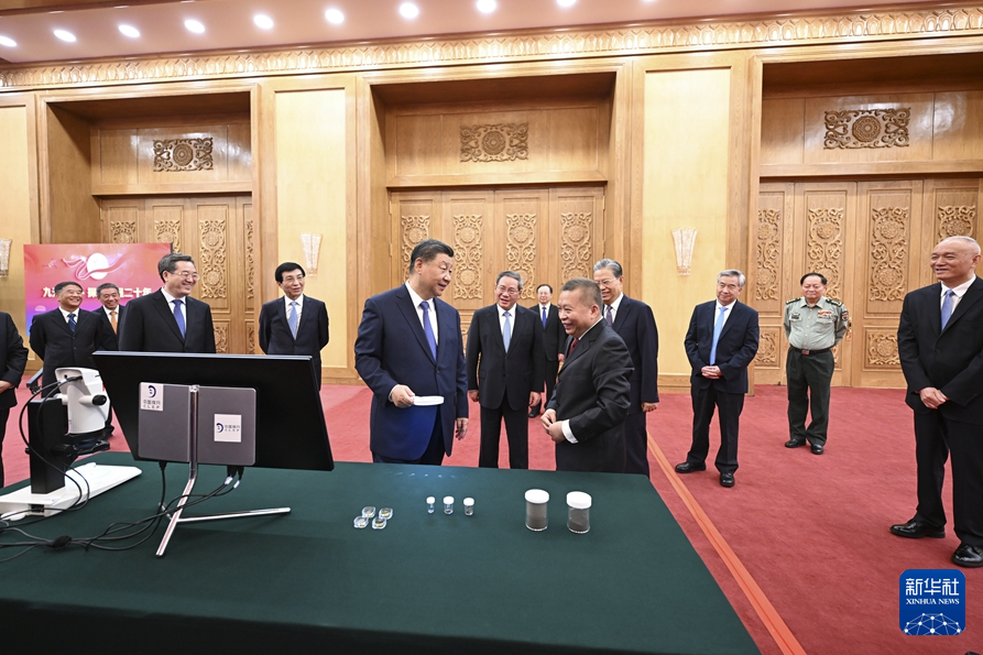 9月23日,黨和國(guó)家領(lǐng)導(dǎo)人習(xí)近平、李強(qiáng)、趙樂(lè)際、王滬寧、蔡奇、丁薛祥、李希等在人民大會(huì)堂接見(jiàn)探月工程嫦娥六號(hào)任務(wù)參研參試人員代表并參觀月球樣品和探月工程成果展覽。這是習(xí)近平等參觀月球樣品和探月工程成果展覽。