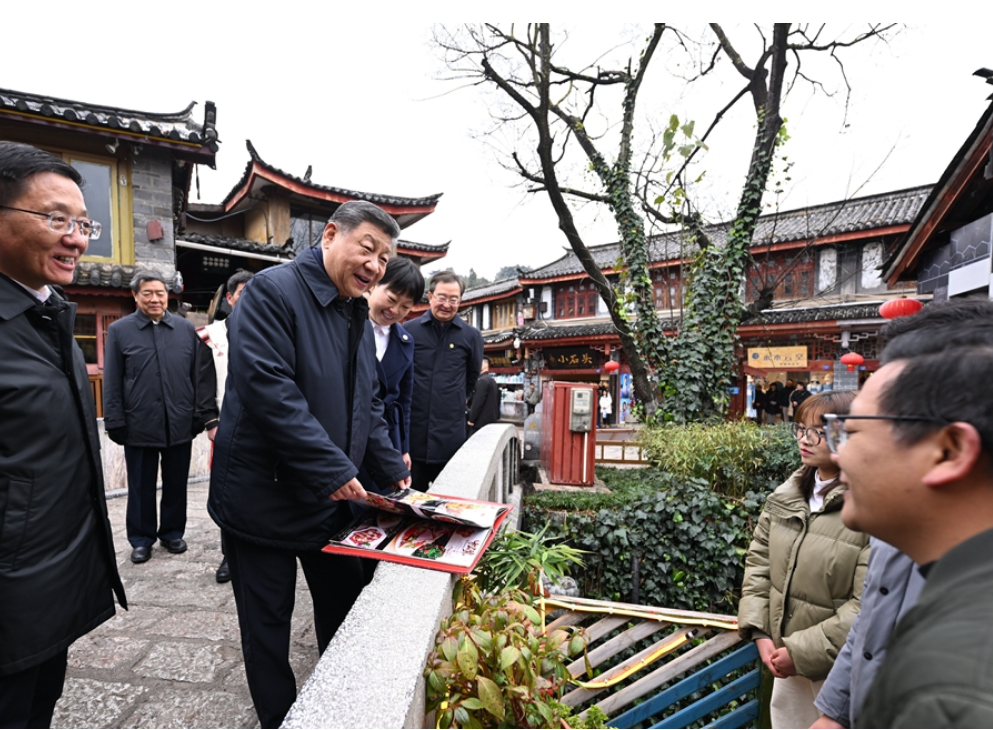 麗江古城有800多年歷史,被列入世界文化遺產(chǎn)名錄。一場春雪過后,麗江游人如織。習(xí)近平來到這里,詳細了解古城營建歷史、納西族民居特色和當(dāng)?shù)匚幕z產(chǎn)保護利用、推動文旅融合發(fā)展等情況。居民和游客見到總書記十分興奮,爭相問好,有的還彈奏樂器、載歌載舞歡迎總書記。習(xí)近平頻頻與大家互動交流,了解商鋪經(jīng)營狀況和游客感受。他要求當(dāng)?shù)靥幚砗帽Wo和發(fā)展的關(guān)系,讓這座美麗的古城煥發(fā)新的光彩。
