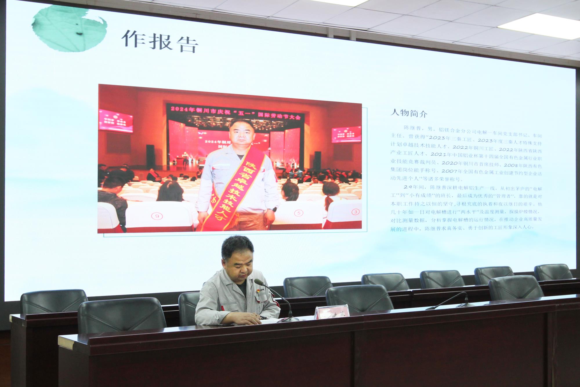 在作報告環(huán)節(jié),陜西美鑫公司職工代表—“三秦工匠”陳繼普為大家分享了他在工作中體會的感悟。1994年被招工到銅川鋁廠,他一干就是三十年,從電解工到小組長、班長、工區(qū)長、車間主任,從派遣外出受所在單位表彰到進入鋁鎂合金分公司,從“2020年銅川市首席技師”到“2023年三秦工匠”,他一步一個腳印踏踏實實地努力,在平凡的崗位上默默耕耘。他勇于擔(dān)當(dāng)、敬業(yè)奉獻的先進事跡也深深打動了在場的每一位職工,大家紛紛表示要以他們?yōu)榘駱?,不斷提升自己的道德修養(yǎng)和工作能力,不懈耕耘、孜孜以求,創(chuàng)造無怨無悔人生。